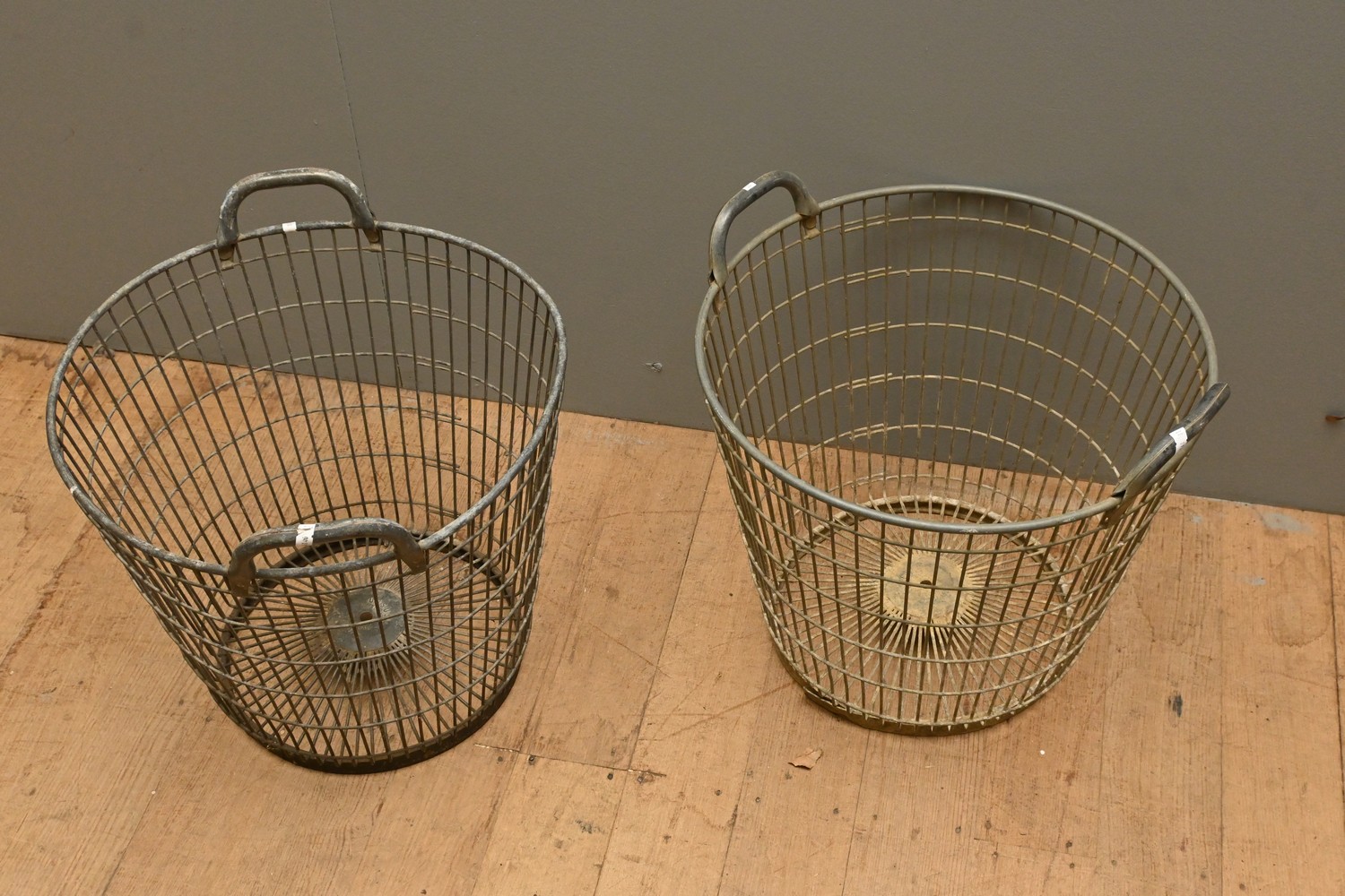 A PAIR OF FRENCH GALVANISED WIRE FORM FRUIT BASKETS (43H X 46D CM) (LEONARD JOEL DELIVERY SIZE: LARGE)