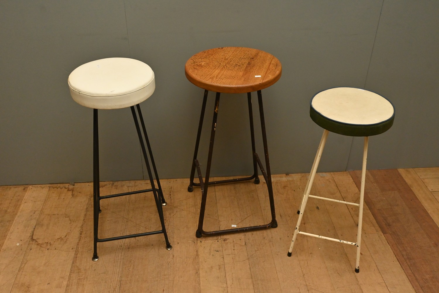 A GROUP OF THREE VINTAGE METAL BASED INDUSTRIAL STOOLS (A/F) (78H X 32W X 32D CM) (LEONARD JOEL DELIVERY SIZE: LARGE)