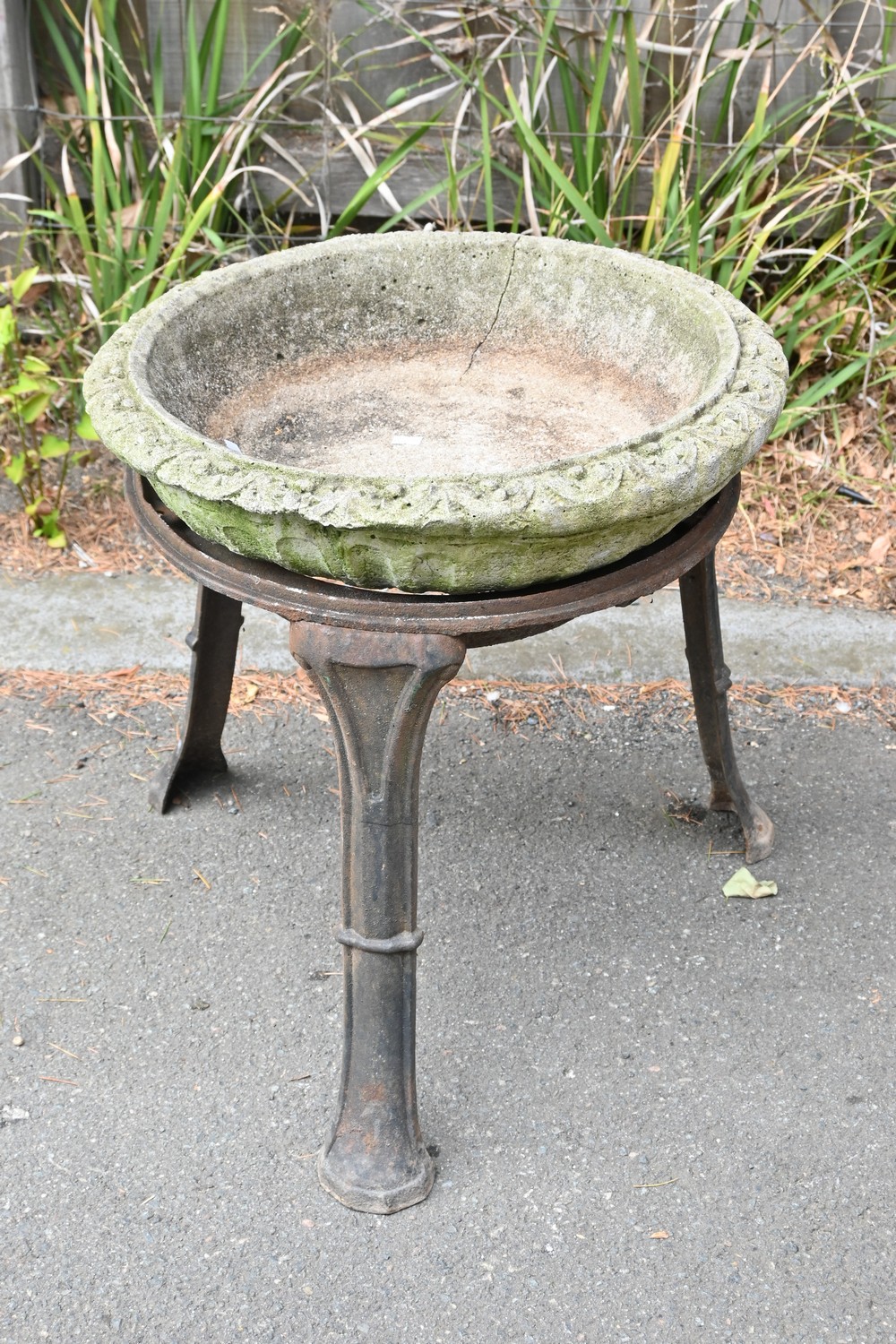 AN ANTIQUE CAST IRON BASED RECONSTITUTED STONE BIRD BATH (A/F) (53H X 49D CM) (PLEASE NOTE THIS HEAVY ITEM MUST BE REMOVED BY CARRIERS AT THE CUSTOMER'S EXPENSE. LEONARD JOEL STAFF CANNOT ASSIST CARRYING THIS ITEM) (X-LARGE ITEM)