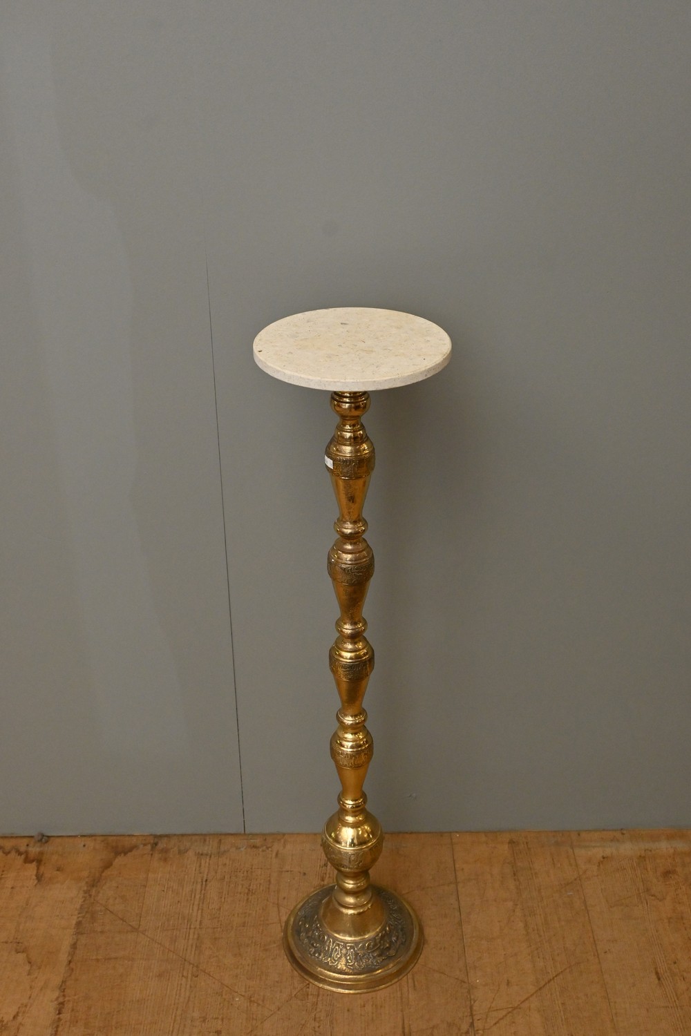 A VINTAGE ITALIAN BRASS BASED CIRCULAR MARBLE TOPPED PEDESTAL (104H X 24DIA CM) (LEONARD JOEL DELIVERY SIZE: LARGE)