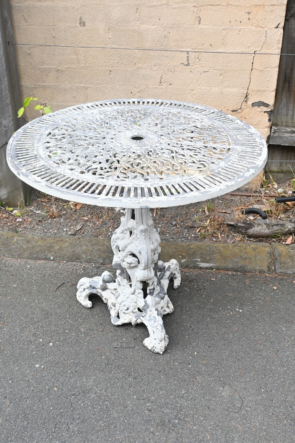 A VINTAGE FRENCH STYLE WHITE METAL GARDEN TABLE (A/F) (67H X 76D CM) (LEONARD JOEL DELIVERY SIZE: LARGE)
