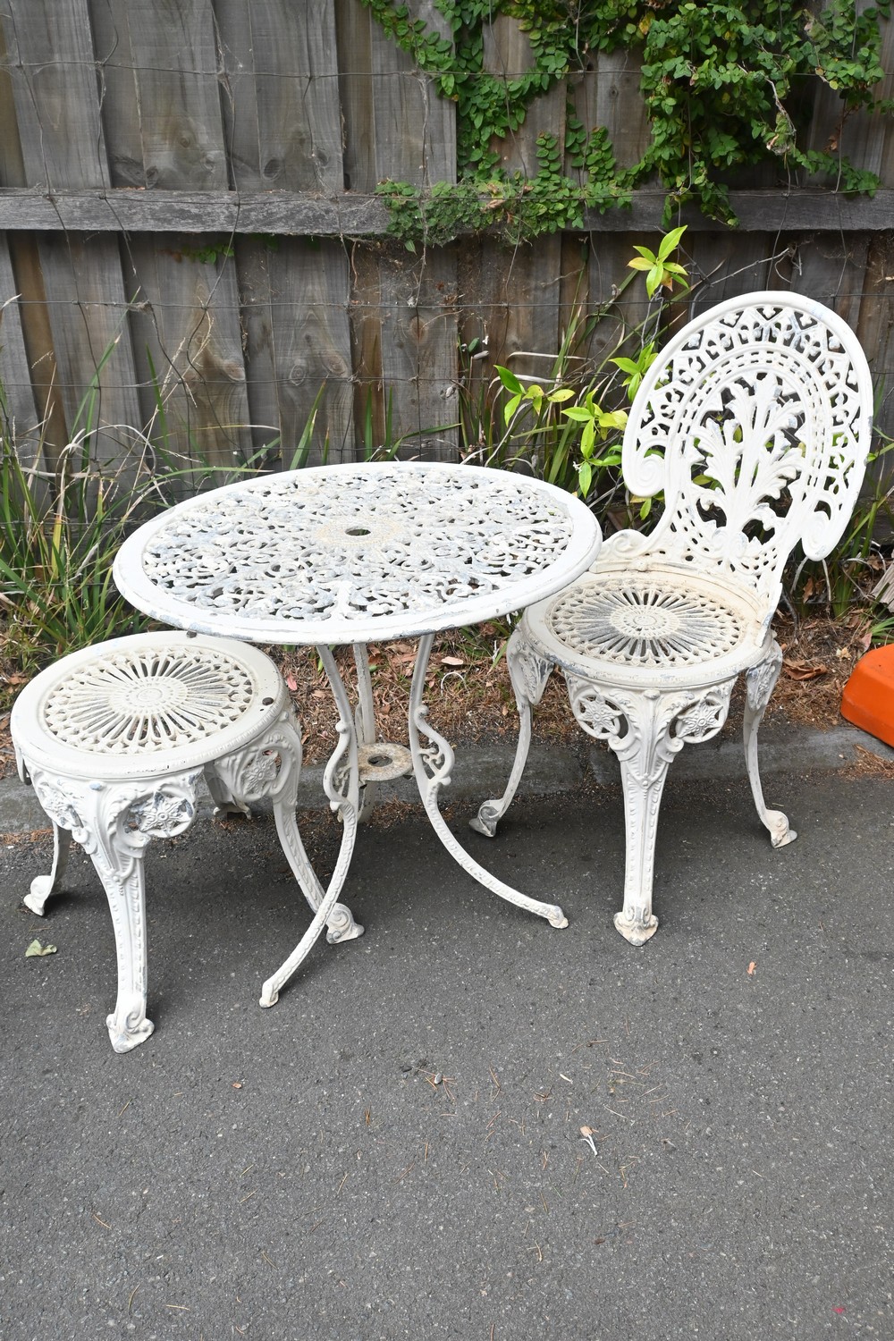 A VINTAGE THREE-PIECE WHITE METAL OUTDOOR SETTING (A/F) (TABLE 65H X 66D CM) (LEONARD JOEL DELIVERY SIZE: LARGE)