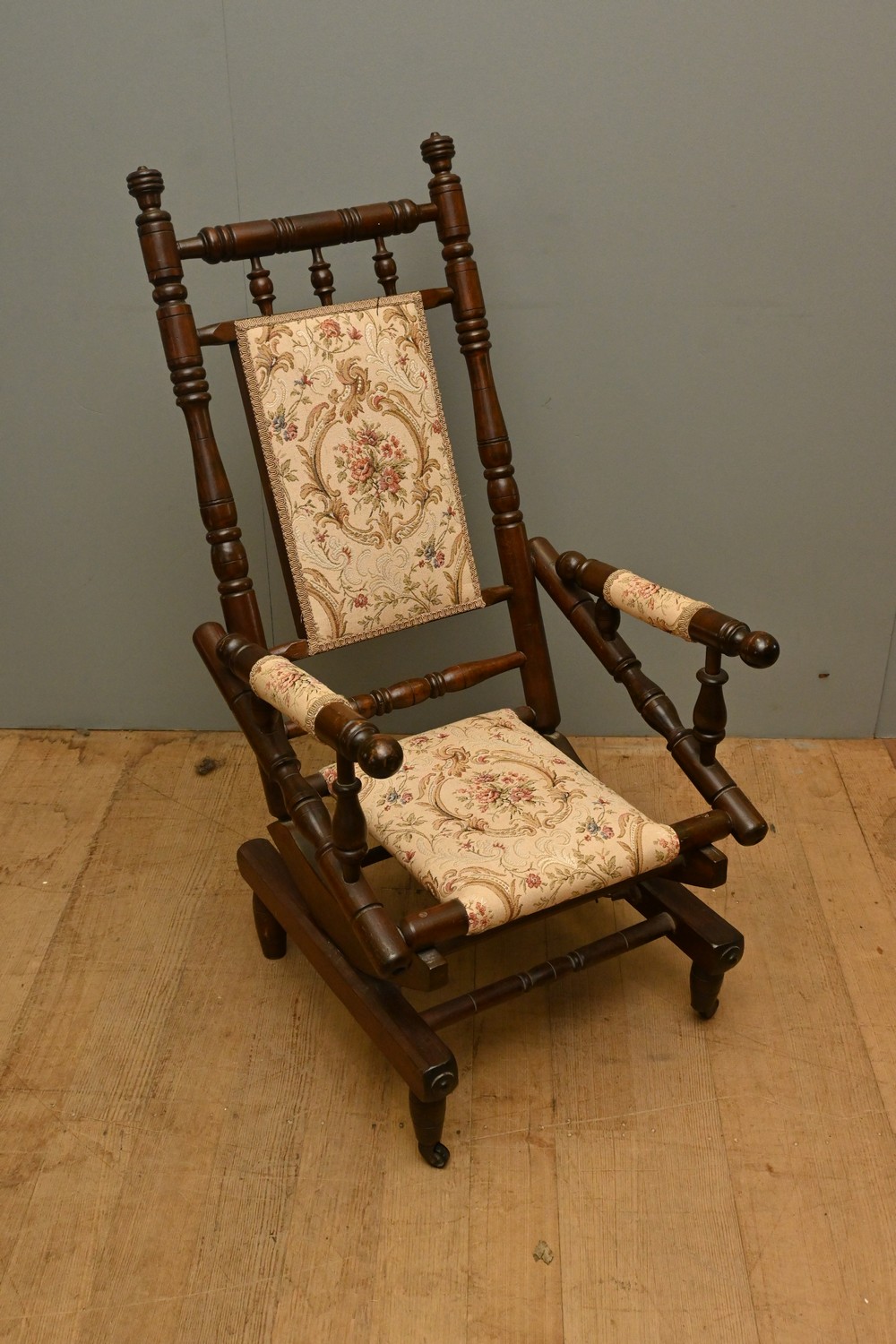 AN EARLY 20TH CENTURY UPHOLSTERED WOODEN ROCKING CHAIR (A/F) (110H X 56W X 56D CM) (LEONARD JOEL DELIVERY SIZE: LARGE)