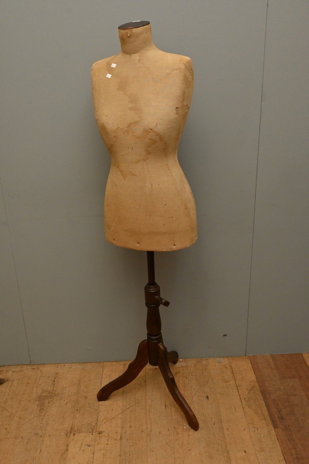 A VINTAGE ADJUSTABLE WOODEN MOUNTED DRESSMAKERS MANEQUIN (A/F) (155H CM) (LEONARD JOEL DELIVERY SIZE: LARGE)