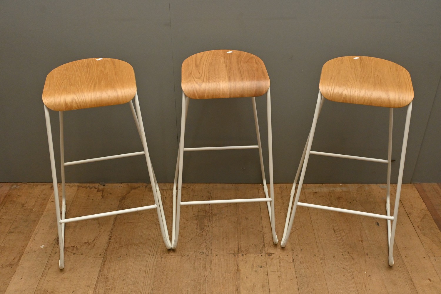 SET OF THREE CONTEMPORARY WHITE METAL AND WOODEN STOOLS (A/F) (75H X 43W X 43D CM) (LEONARD JOEL DELIVERY SIZE: LARGE)