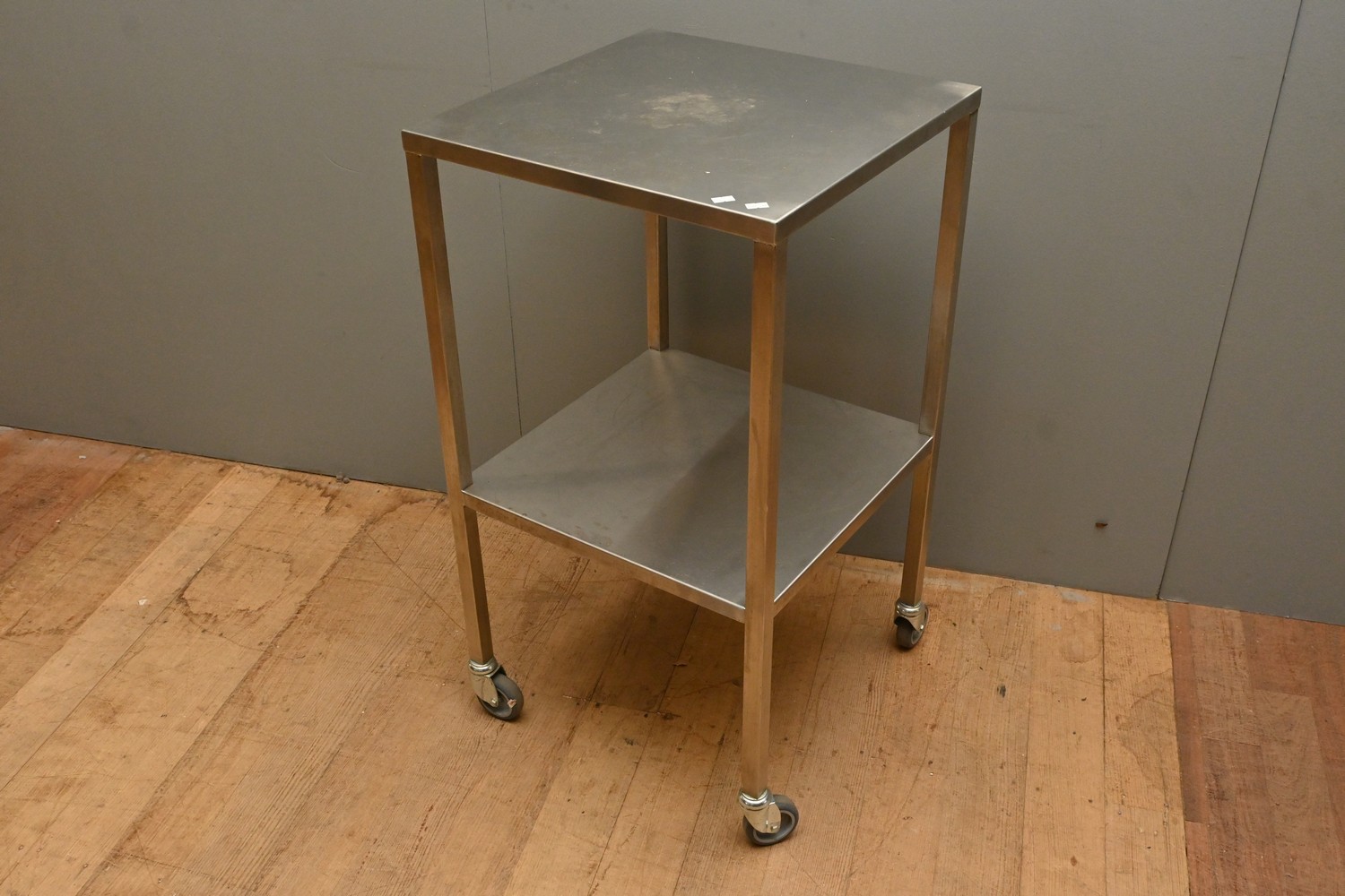 A VINTAGE STAINLESS STEEL TWO TIER TROLLEY ON CASTORS (A/F) (90H X 50W X 50D CM) (LEONARD JOEL DELIVERY SIZE: LARGE)