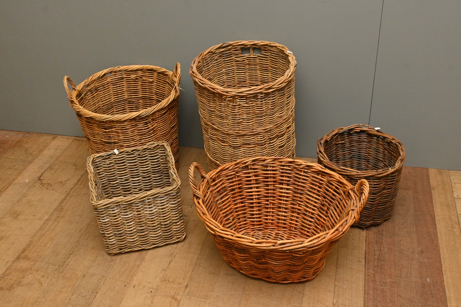 A COLLECTION OF FIVE VINTAGE CANE BASKETS (LARGEST 61H X 46D CM) (LEONARD JOEL DELIVERY SIZE: LARGE)