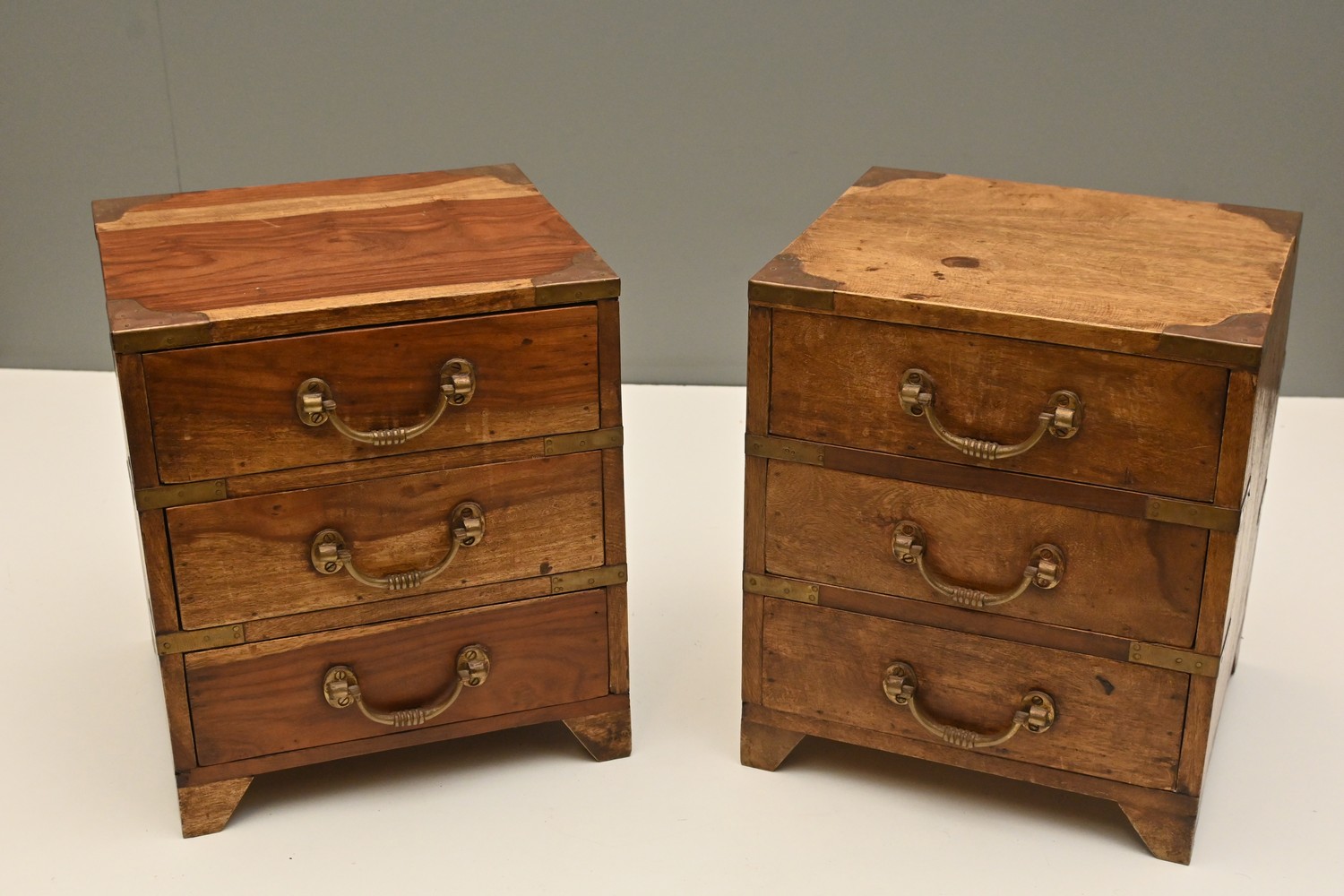 A PAIR OF VINTAGE BRASS BOUND AND HANDLED THREE DRAWER MINIATURE CABINETS (A/F) (30H X 26W X 23D CM) (LEONARD JOEL DELIVERY SIZE: LARGE)