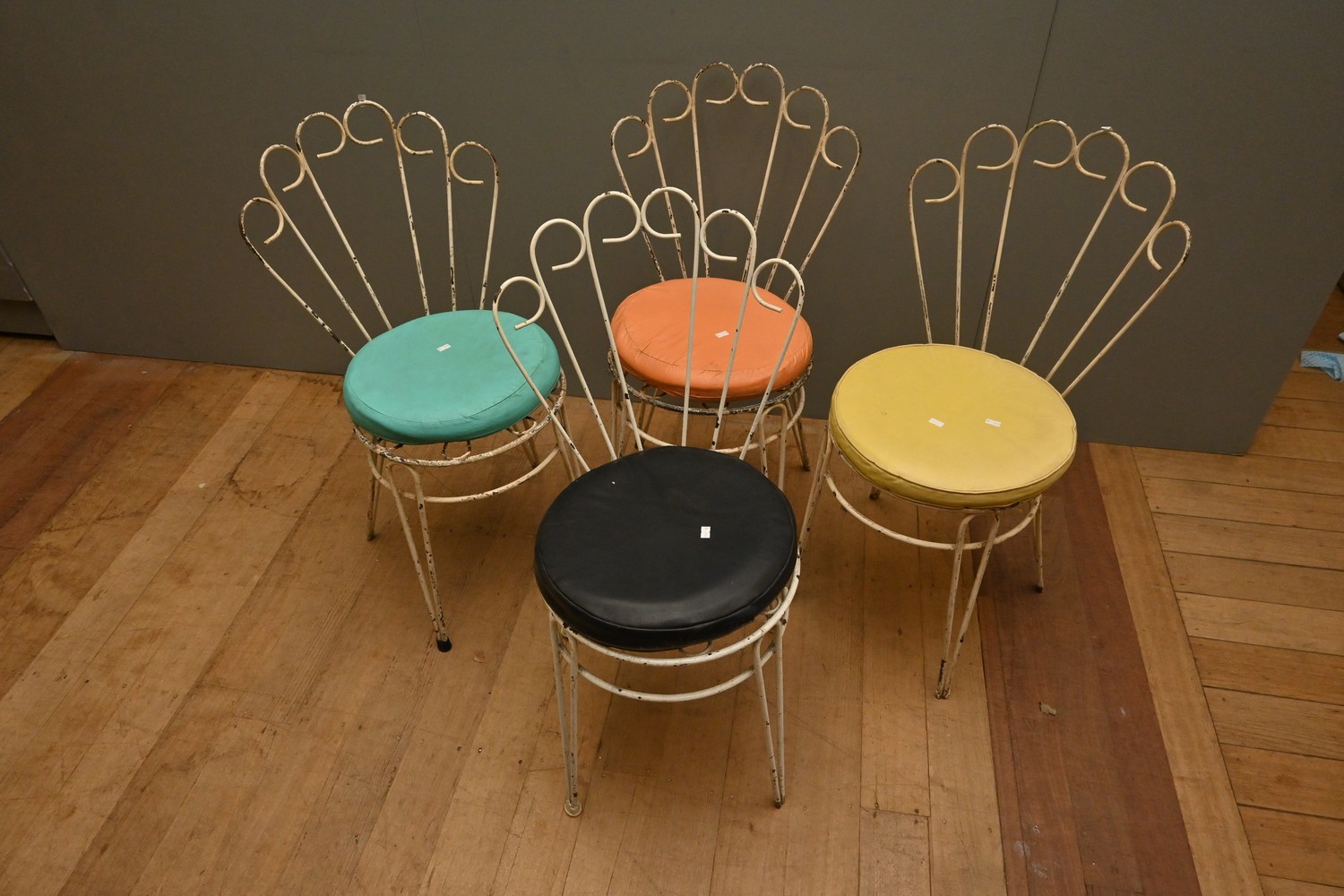 A SET OF FOUR VINTAGE 1940S FRENCH WHITE IRON FRAMED CHAIRS WITH REMOVABLE VINYL CUSHIONS (A/F) (83H X 43W X 46D CM) (LEONARD JOEL DELIVERY SIZE: LARGE)