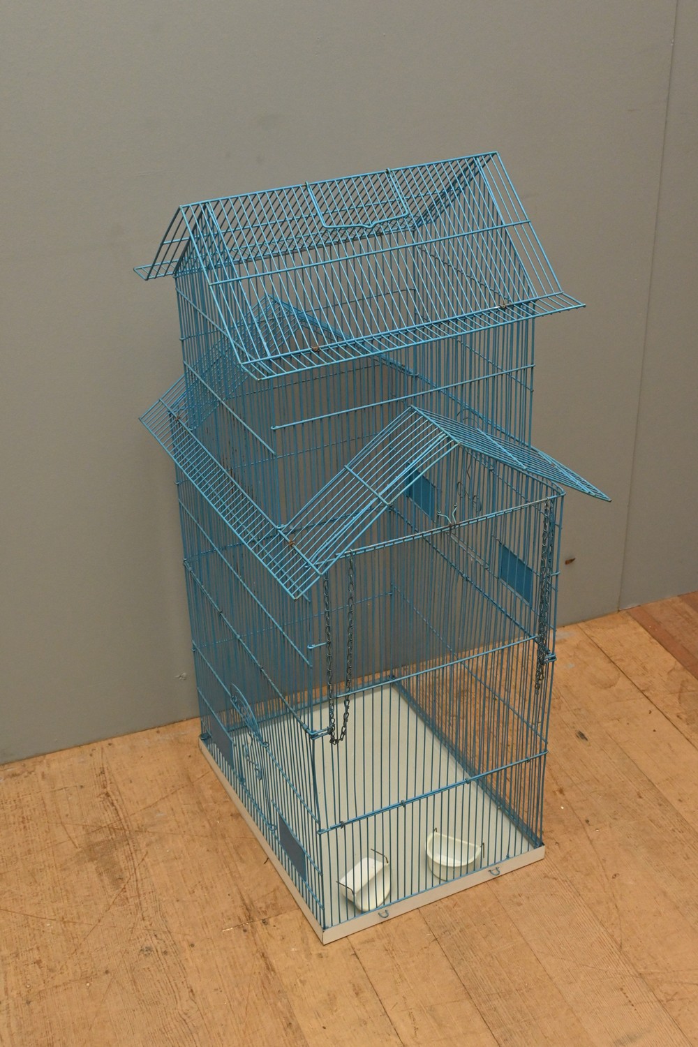 A VINTAGE BLUE WIRE FORM BIRD CAGE (94H X 53W X 48D CM) (LEONARD JOEL DELIVERY SIZE: LARGE)