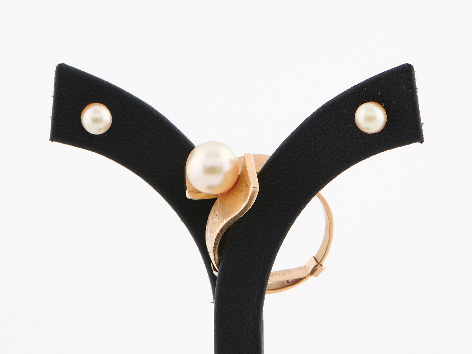 A PEARL SET RING IN 9CT GOLD, RING SIZE N WITH SLEEVE TOGETHER WITH A PAIR OF PEARL STUDS EARRINGS IN 9CT GOLD, TO POST AND BUTTERFLY FITTINGS, TOTAL WEIGHT 7.1GMS