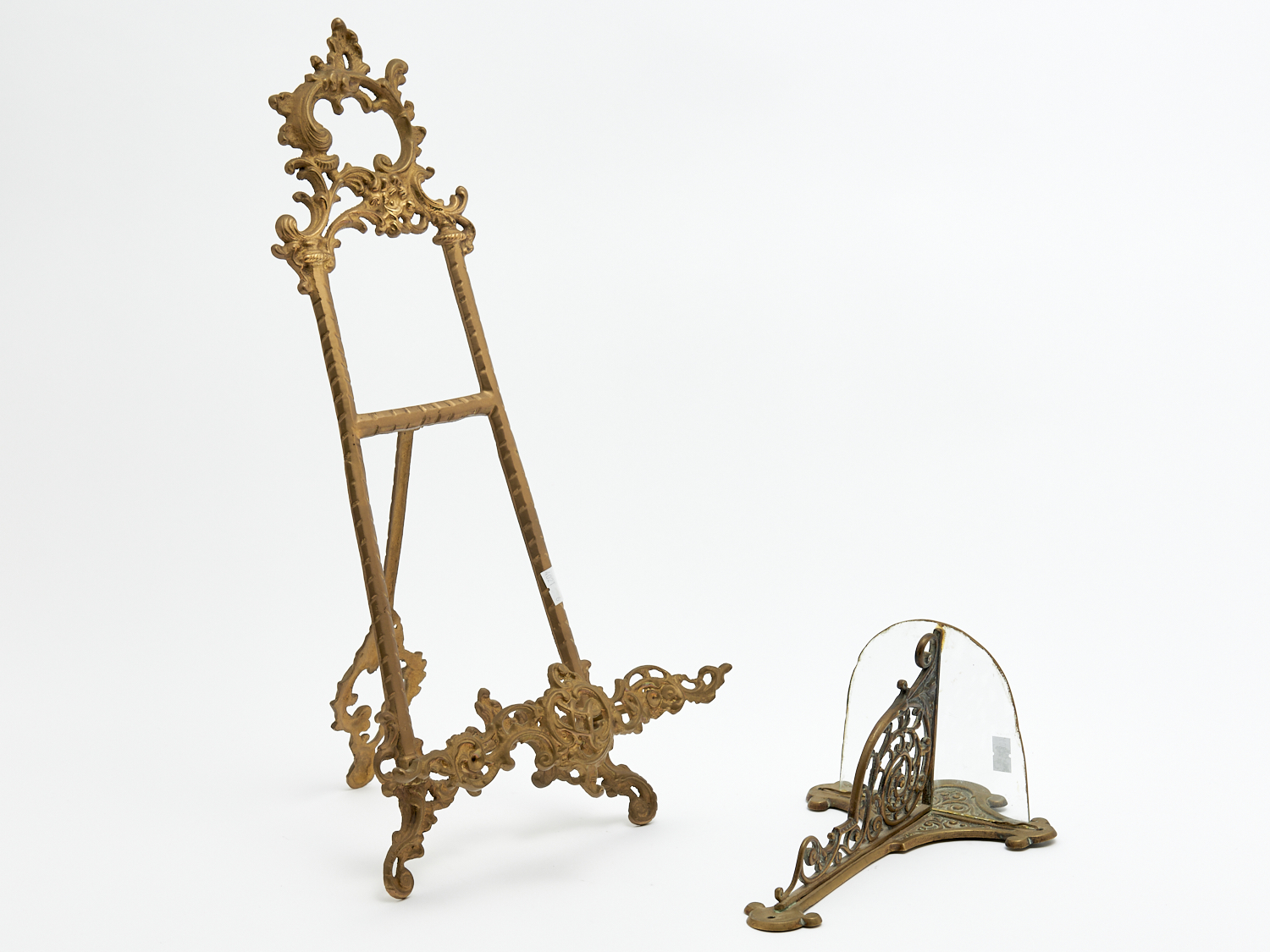 A VINTAGE BRASS EASEL AND WALL BRACKET WITH GLASS H.50CM (LARGEST), LEONARD JOEL LOCAL DELIVERY: MEDIUM
