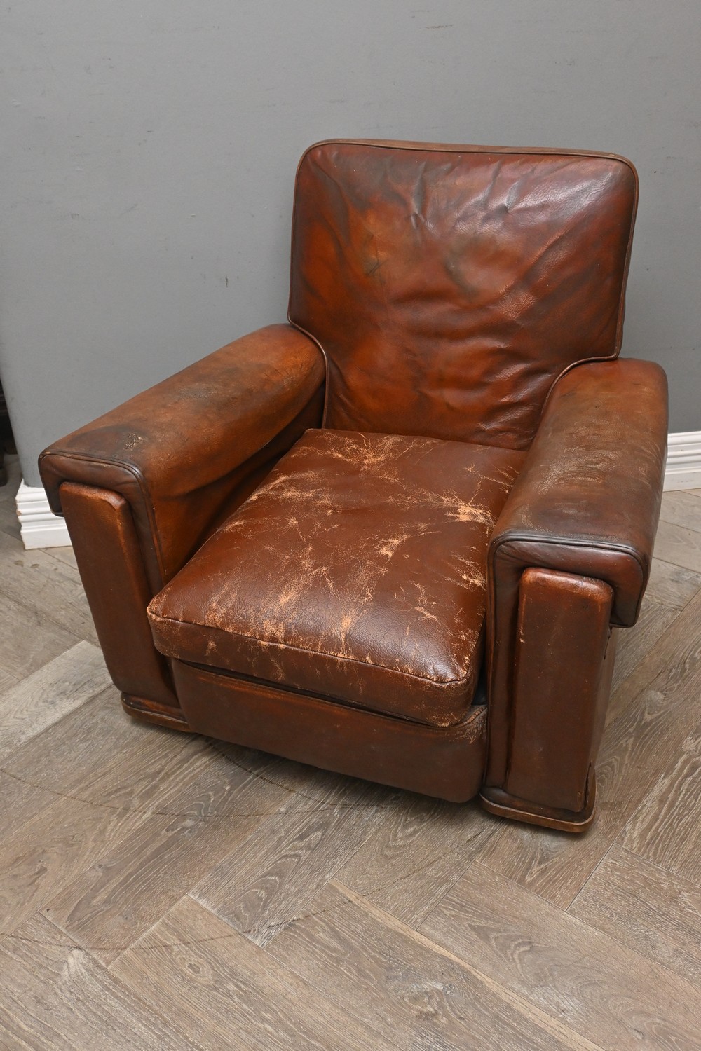 AN ART DECO LEATHER ARMCHAIR (A/F) (84H X 87W X 75D CM) (LEONARD JOEL DELIVERY SIZE: X-LARGE)