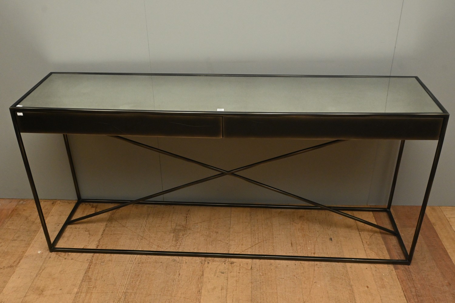 A CONTEMPORARY METAL HALL CONSOLE WITH MIRRORED TOP (A/F) (76H X 168W X 40D CM)  (PLEASE NOTE THIS HEAVY ITEM MUST BE REMOVED BY CARRIERS AT THE CUSTOMER'S EXPENSE. LEONARD JOEL STAFF CANNOT ASSIST CARRYING THIS ITEM) (X-LARGE ITEM)