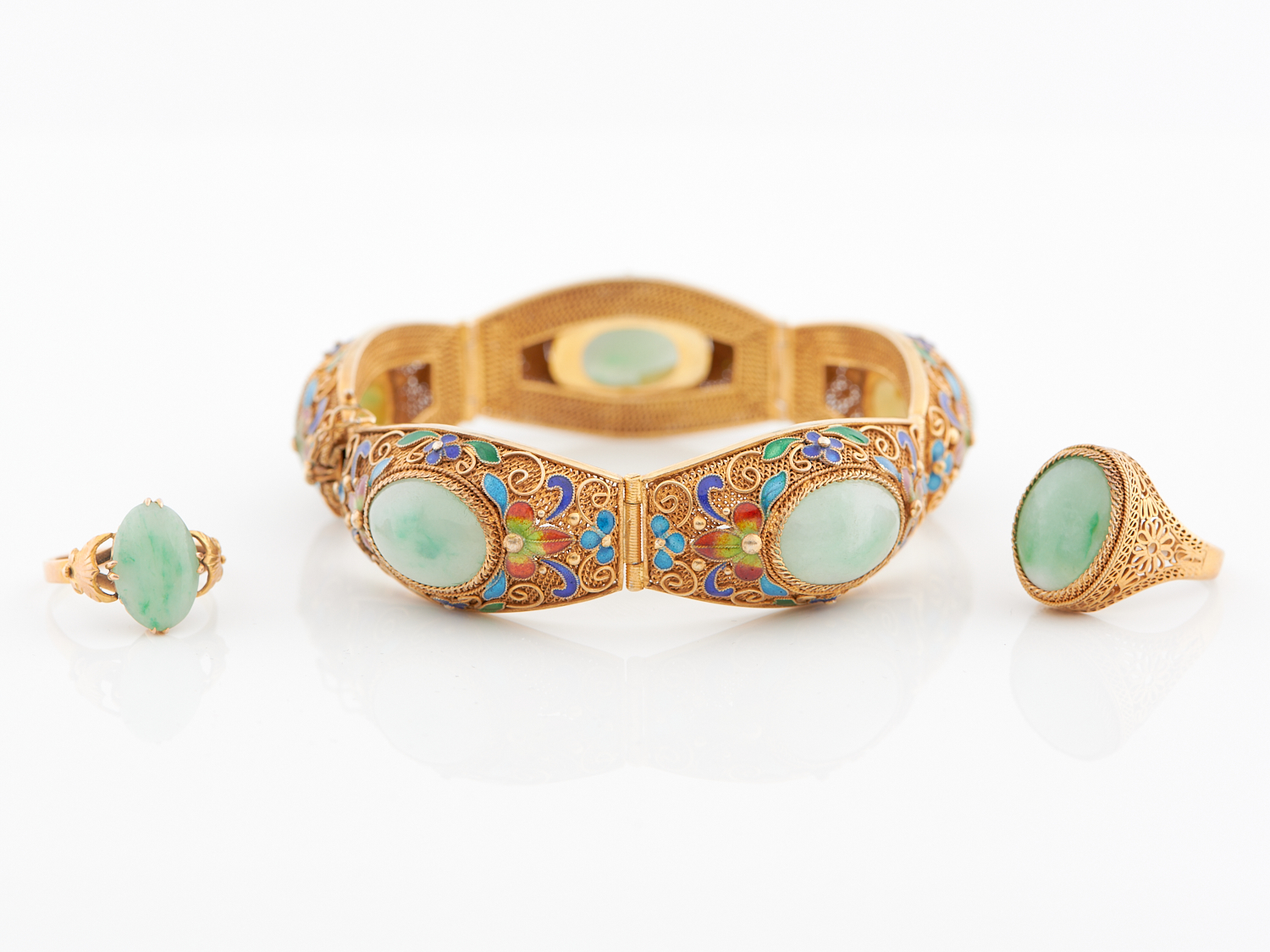 TWO JADE RINGS, ONE IN SILVER GILT, RING SIZE O, THE OTHER IN 14CT GOLD, RING SIZE M, ALONG WITH A JADE AND ENAMLE BANGLE IN SILVER GILT, 190MM