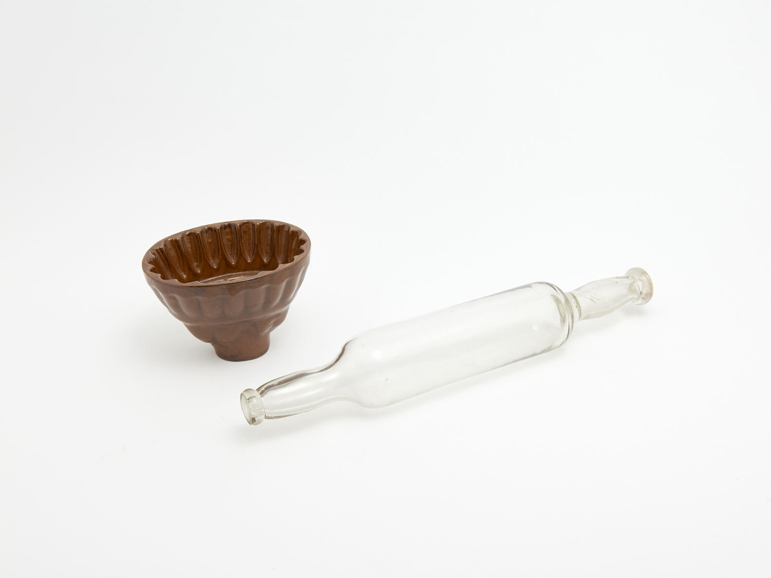 A CERAMIC JELLY MOULD TOGETHER WITH A GLASS ROLLING PIN L.50CM (LARGEST), LEONARD JOEL LOCAL DELIVERY: SMALL
