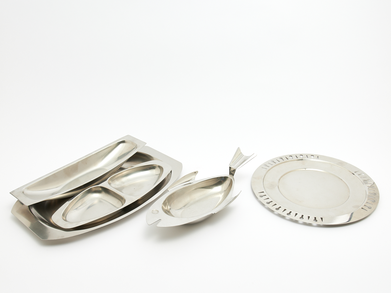ITALIAN AND DANISH STAINLESS STEEL TRAYS AND DISHES W.43.5CM (LARGEST), LEONARD JOEL LOCAL DELIVERY: MEDIUM