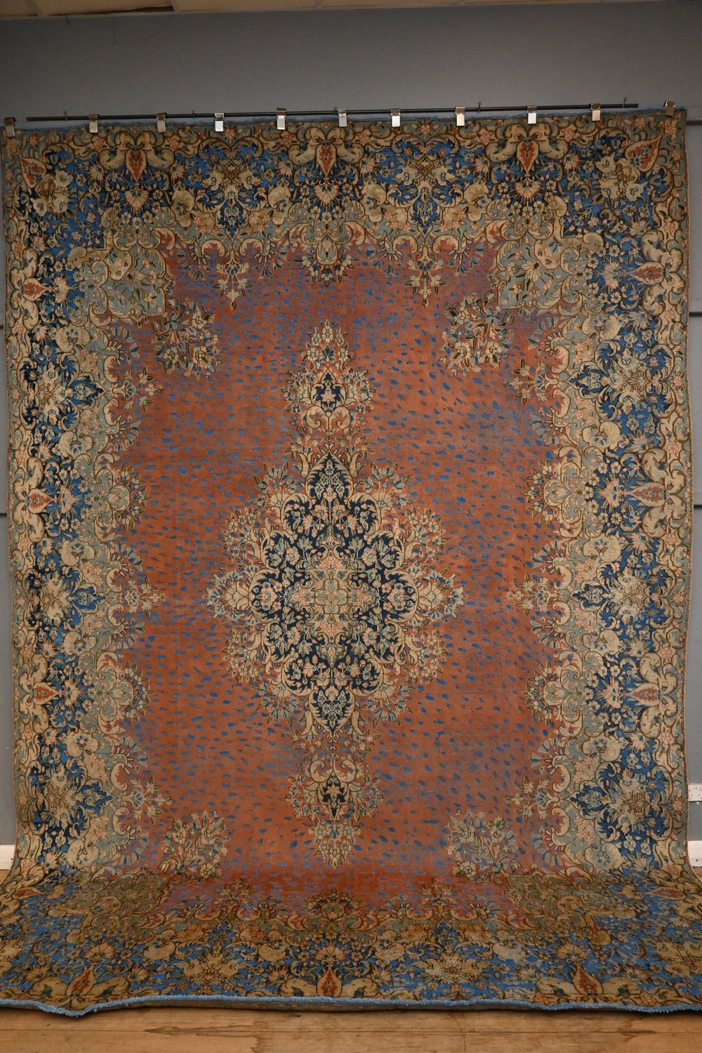EX GALLERY SUPERFINE MODERN OVER-DYED VINTAGE PERSIAN KERMAN CARPET. WITH A CENTRAL FLORAL MEDALLION- CREATED FROM A FINELY HAND-KNOTTED MEDALLIAN DESIGN PERSIAN KERMAN CARPET. THE RUG IS OVER-DYED IN BLUE & RED TONES. SIZE: 404 X 287 CM- ORIGIN: PERSIA - RRP: $6,500, DOCUMENTATION OF AUTHENTICITY INCLUDED.