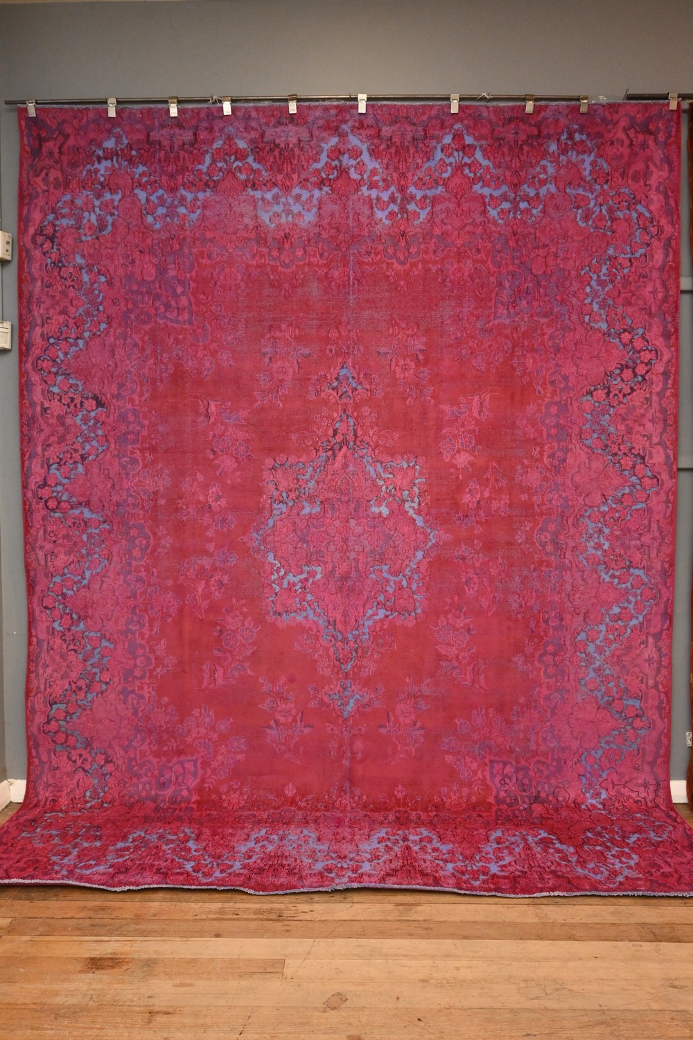 EX GALLERY HAND KNOTTED FINE VINTAGE OVER-DYED PERSIAN KERMAN CARPET. A UNIQUE MODERN CARPET CREATED FROM AN AUTHENTIC VINTAGE MEDALLION DESIGN KERMAN CARPET WITH THE PILE SHORN AND OVER-DYED IN VIBRANT RED AND FRENCH BLUE TONES. ORIGIN: PERSIA - RRP: $6,500- SIZE: 392 x 296 CM, DOCUMENTATION OF AUTHENTICITY INCLUDED