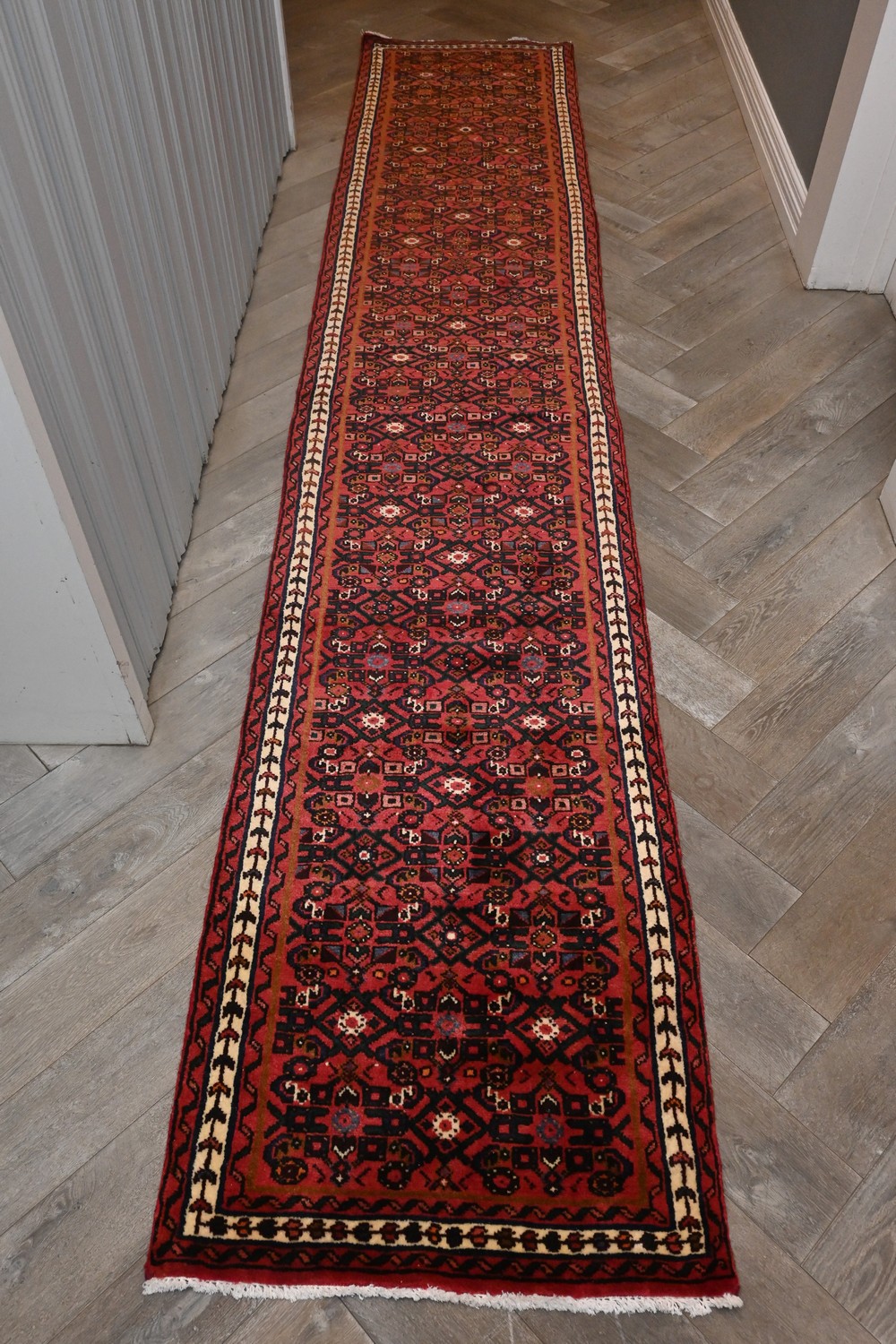 A BRAND-NEW PERSIAN HOSSAINABAD HALL RUNNER. 100% LUSH WOOL PILE SOLID & HARD-WEARING. VILLAGE WEAVE FROM THE HAMADAN REGION WITH TRADITIONAL DESIGN OF ALL-OVER FLORAL HERATI MAHI PATTERNS IN A SOFT RED FIELD. BORDER OF FLORAL MOTIFS. SIZE: 405 X 78 CM, ORIGIN: PERSIA - RRP: $2,900, DOCUMENTATION OF AUTHENTICITY INCLUDED
