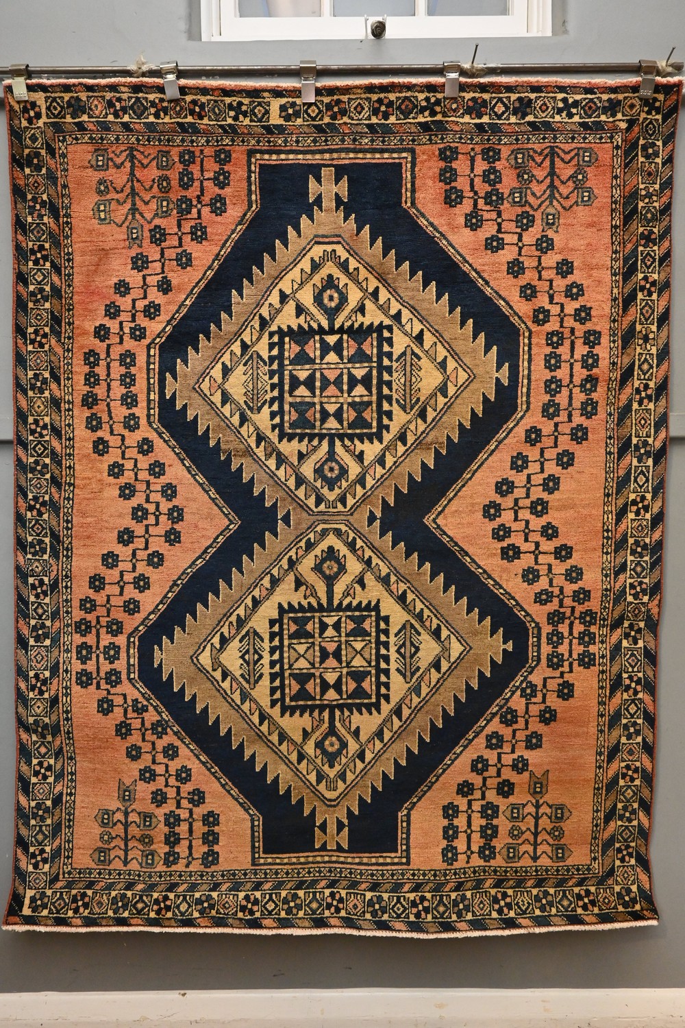 A CIRCA 1970'S PERSIAN TRIBAL AFSHAR RUG. 100% WOOL AND ORGANIC DYES, SEMI VINTAGE PILE. DOUBLE DIAMOND MEDALLIONS WITH TRIBAL TREE OF LIFE MOTIFS. ORIGIN: PERSIA - RRP: $2,500 SIZE: 205 X 160 CM, DOCUMENTATION OF AUTHENTICITY INCLUDED