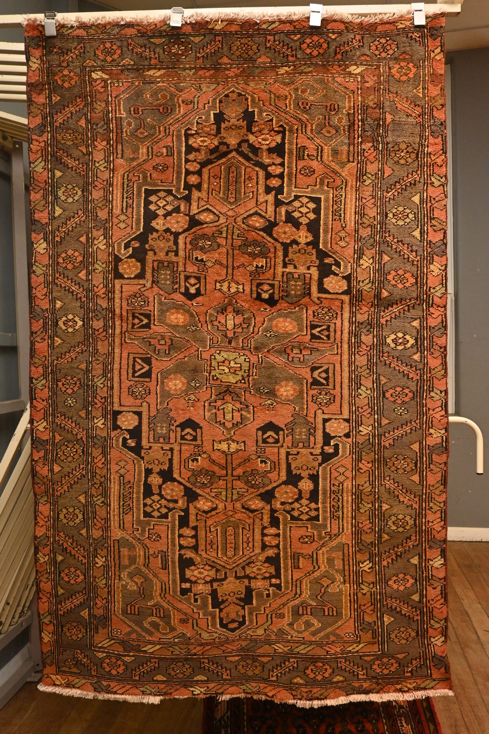 A PERSIAN TRIBAL KHAMSEH RUG.100% HAND-SPUN WOOL PILE USING ALL NATURAL DYES. TRIBAL DESIGN WITH AN ANCHORED MEDALLION IN A FIELD OF ALL OVER TRIBAL MOTIFS. WOVEN IN THE REGION OF HAMADAN. SIZE: 204 X 127 CM, ORIGIN: PERSIA - RRP: $1,400, DOCUMENTATION OF AUTHENTICITY INCLUDED.