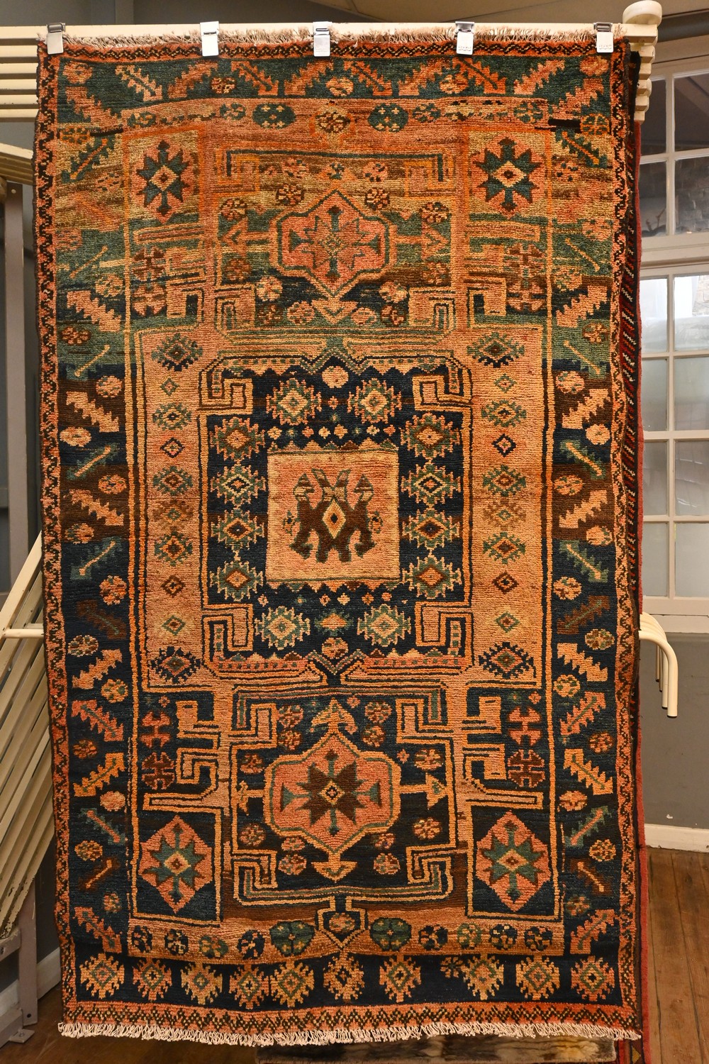A TRIBAL PERSIAN KOOHI RUG, 100% WOOL, NATURAL DYES. HAND-KNOTTED TRIBAL WEAVE WITH DESIGN OF CENTRAL GEOMETRIC MEDALLIONS IN A FIELD OF TRIBAL PATTERNS AND ROSETTES. SOFT MELLOW COLOURS TONES. SIZE: 200 X 121 CM, ORIGIN: PERSIA - RRP: $2,300, DOCUMENTATION OF AUTHENTICITY INCLUDED