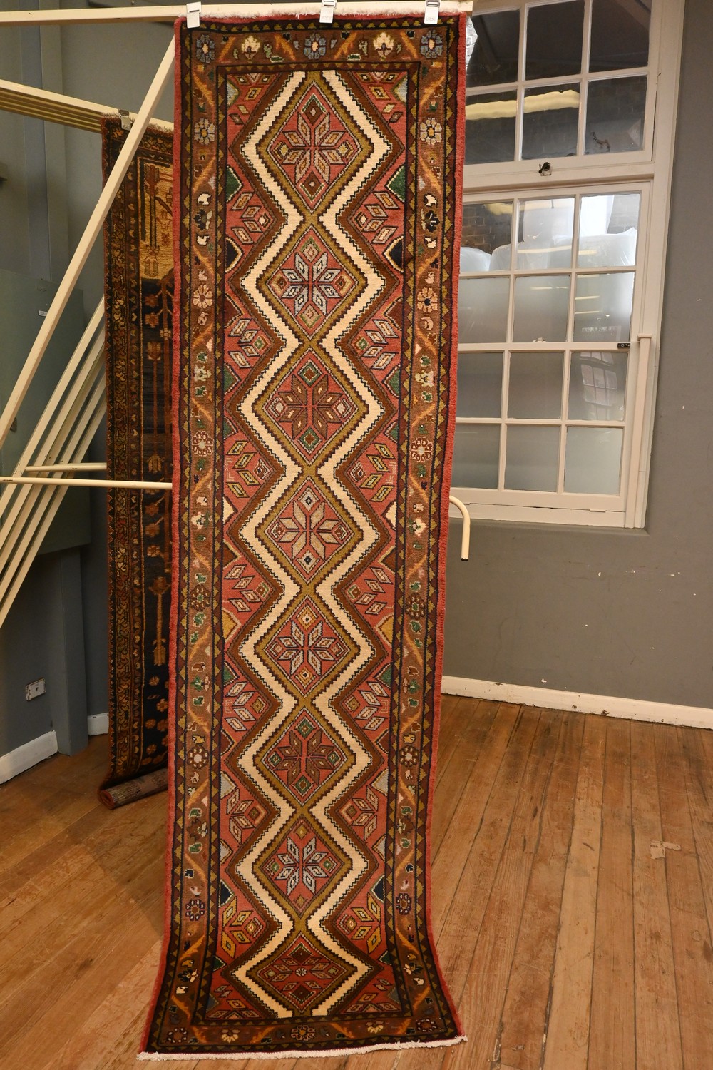 A HAND-KNOTTED HARD WEARING PERSIAN ZAGEH RUNNER, 100% WOOL & NATURAL DYES. CONTINING DIAMOND SHAPED MEDALLIONS CONTAINING FLORAL DESIGNS IN MELLOW COLOURS ON AN OPEN SOFT RED FIELD. SIZE: 285 X 80 CM -ORIGIN: IRAN - RRP: $1,400, DOCUMENTATION OF AUTHENTICITY INCLUDED