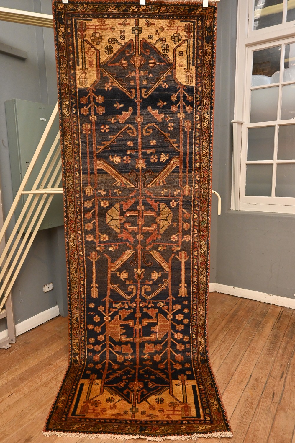 A TRIBAL VINTAGE PERSIAN AVAJ RUG,100% HAND SPUN WOOL, VINTAGE PILE. NATURAL DYES. HAND-KNOTTED VILLAGE WEAVE FROM THE QAZVINN PROVINCE HAND-KNOTTED WEAVE WITH A DESIGN OF GEOMETRIC TRIBAL MEDALLIONS AND TREE OF LIFE MOTIFS ON A NAVY FIELD. SIZE: 312 X 101 CM, ORIGIN: PERSIA - RRP: $1,400, DOCUMENTATION OF AUTHENTICITY INCLUDED