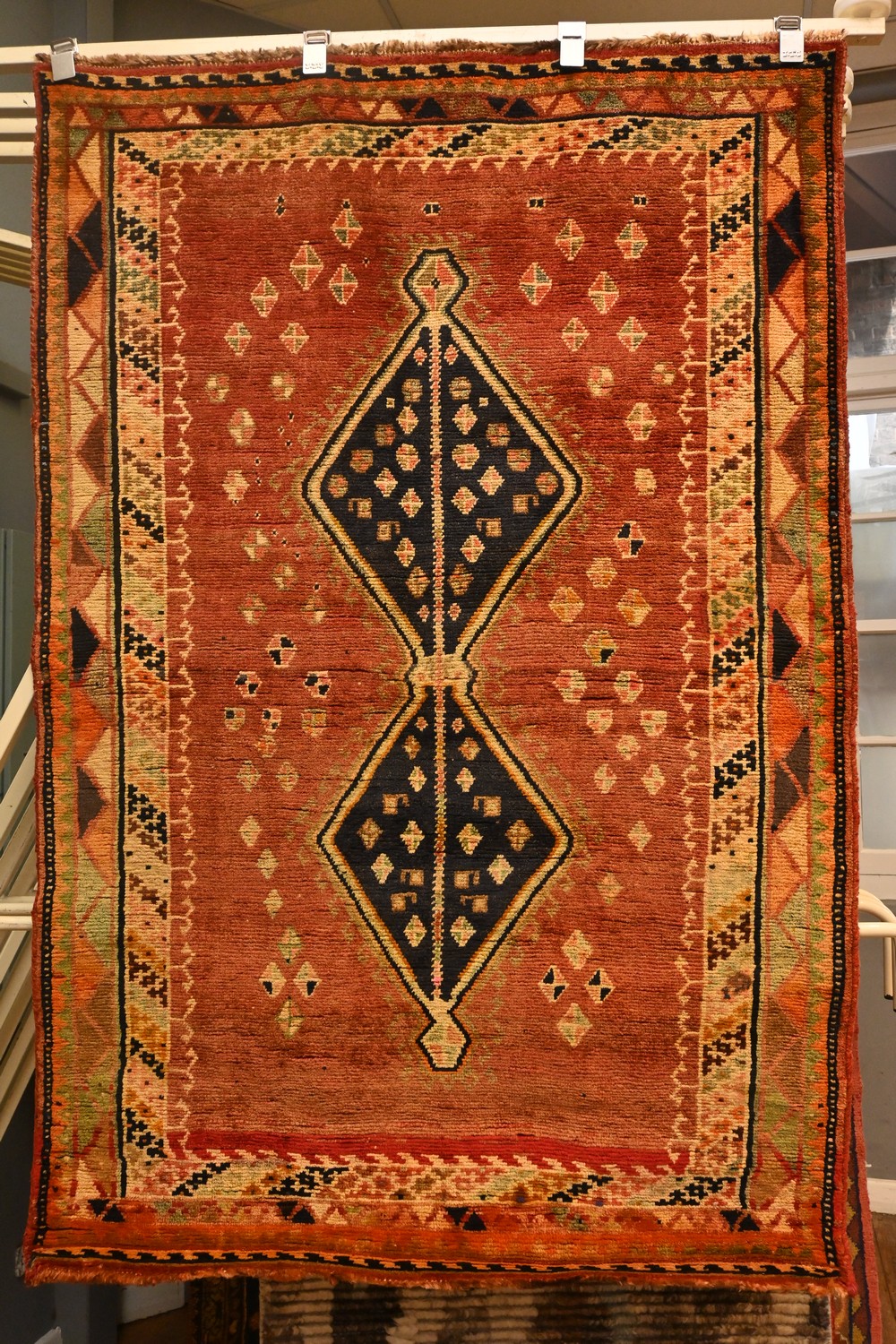 A TRIBAL PERSIAN GABBEH RUG. 100% WOOL WARP AND WEFT FOUNDATION, HAND-SPUN WOOL, NATURAL DYES. HAND-KNOTTED TRIBAL WEAVE WITH DESIGN OF DOUBLE HOOKED DIAMOND HOOKED MEDALLIONS CONTAINING AMULETS ON A POMEGRANATE RED TONE FIELD. ORIGIN: PERSIA - RRP: $950- SIZE: 166 X 110 CM, DOCUMENTATION OF AUTHENTICITY INCLUDED