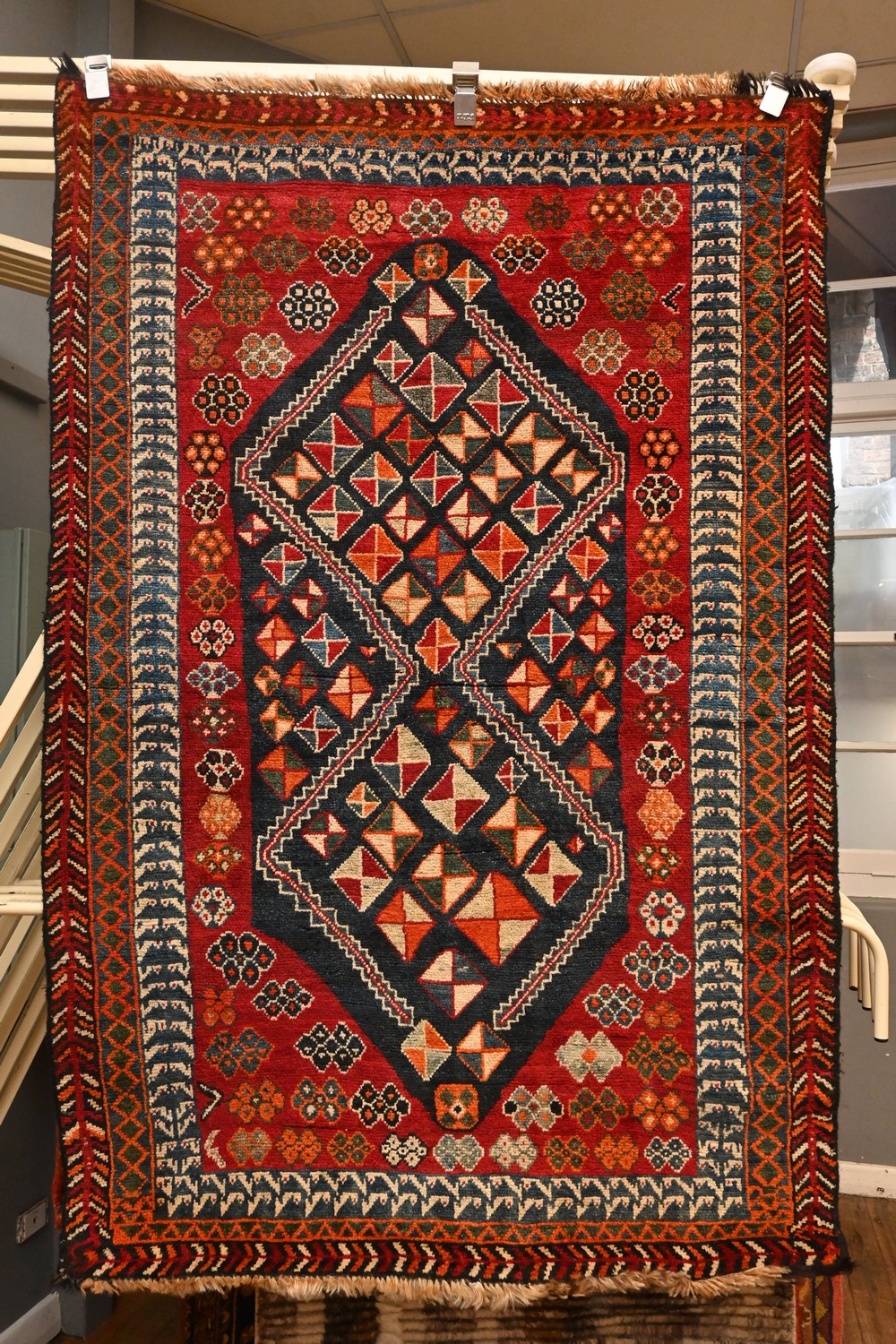 A COLOURFUL PERSIAN QASHQAIE RUG. 100% WOOL WARP AND WEFT PILE. HAND-SPUN WOOL. NATURAL DYES. HAND-KNOTTED TRIBAL QASHQAIE WEAVE WITH DESIGN OF DOUBLE DIAMOND HOOKED MEDALLIONS SET WITHIN A LATCH-HOOKED PATTERN AND TRIBAL MOTIFS. SIZE: 168 X 114 CM-ORIGIN: PERSIA - RRP: $1,100, DOCUMENTATION OF AUTHENTICITY INCLUDED