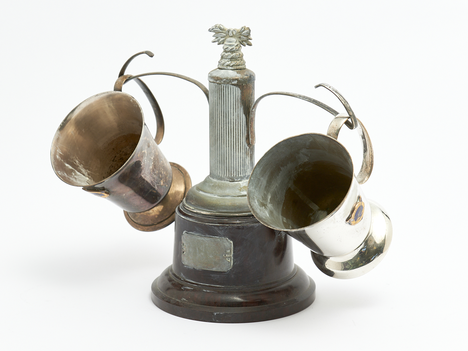 A SILVERPLATED ROSSDALE GOLF CLUB TROPHY WITH TWO HANGING TUMBLERS H.23 X W.29CM, LEONARD JOEL LOCAL DELIVERY: MEDIUM
