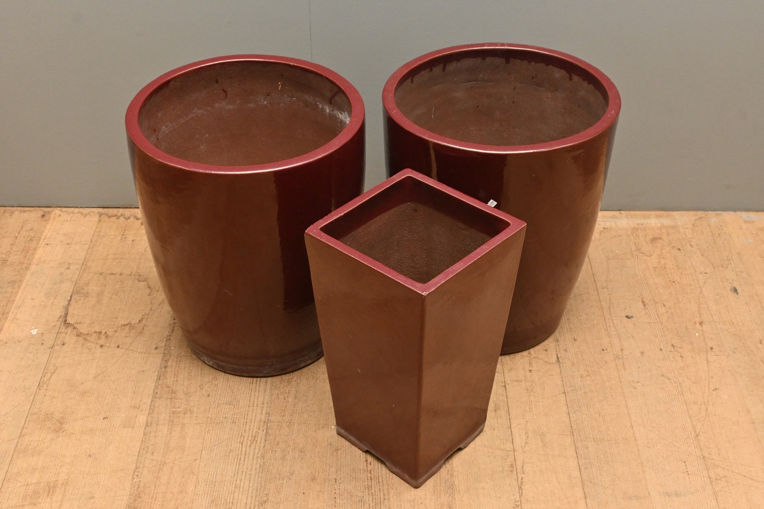 THREE GLAZED GARDEN POTS (48H X 41D CM) (PLEASE NOTE THIS HEAVY ITEM MUST BE REMOVED BY CARRIERS AT THE CUSTOMER'S EXPENSE. LEONARD JOEL STAFF CANNOT ASSIST CARRYING THIS ITEM) (X-LARGE ITEM)