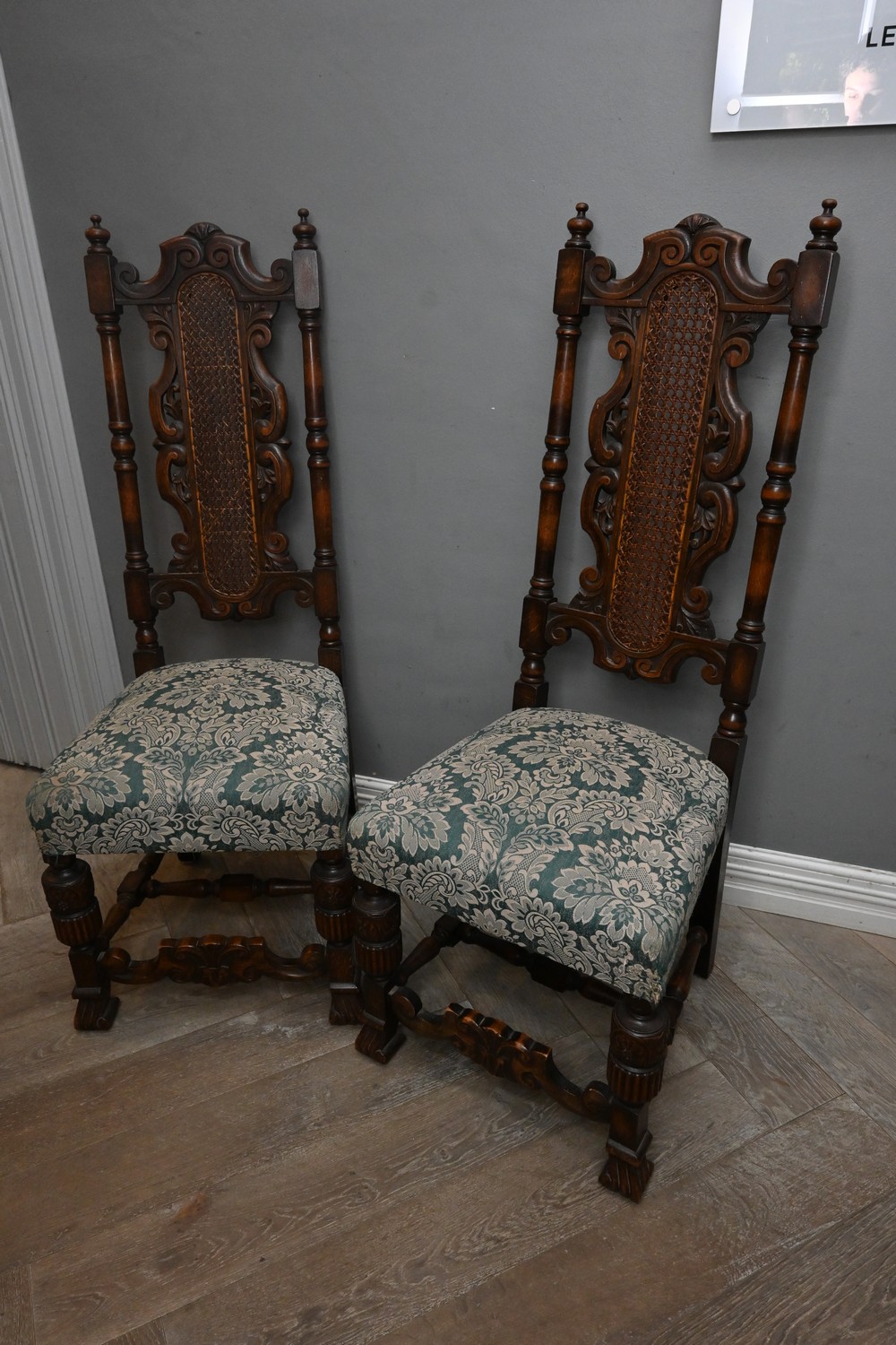 A PAIR OF CAROLEAN-STYLE OAK SIDE CHAIRS (A/F) (129H X 50W X 47D CM) (LEONARD JOEL DELIVERY SIZE: X-LARGE)