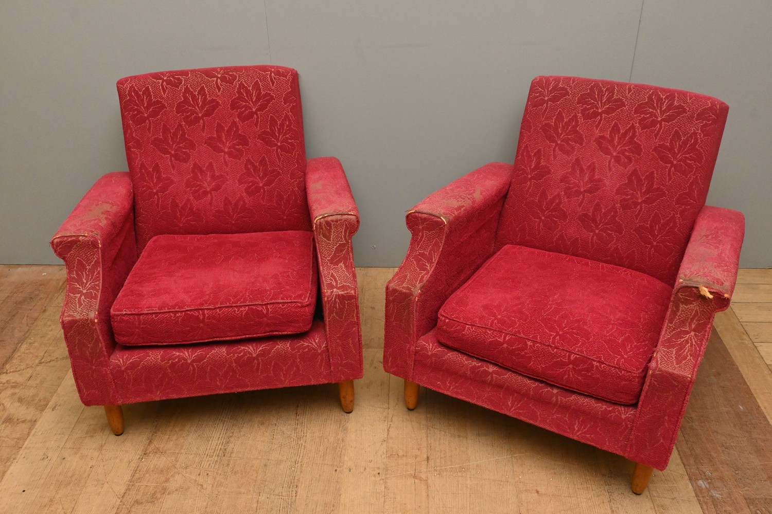 A PAIR OF RETRO UPHOLSTERED ARMCHAIRS (A/F) (78H X 77W X 76D CM) (LEONARD JOEL DELIVERY SIZE: X-LARGE)