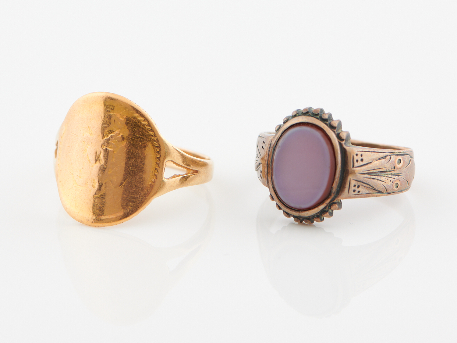 TWO SIGNET RINGS, ONE IN 18CT GOLD (3.1GMS) AND ONE AGATE SET IN GOLD PLATE, RING SIZES H/I AND O