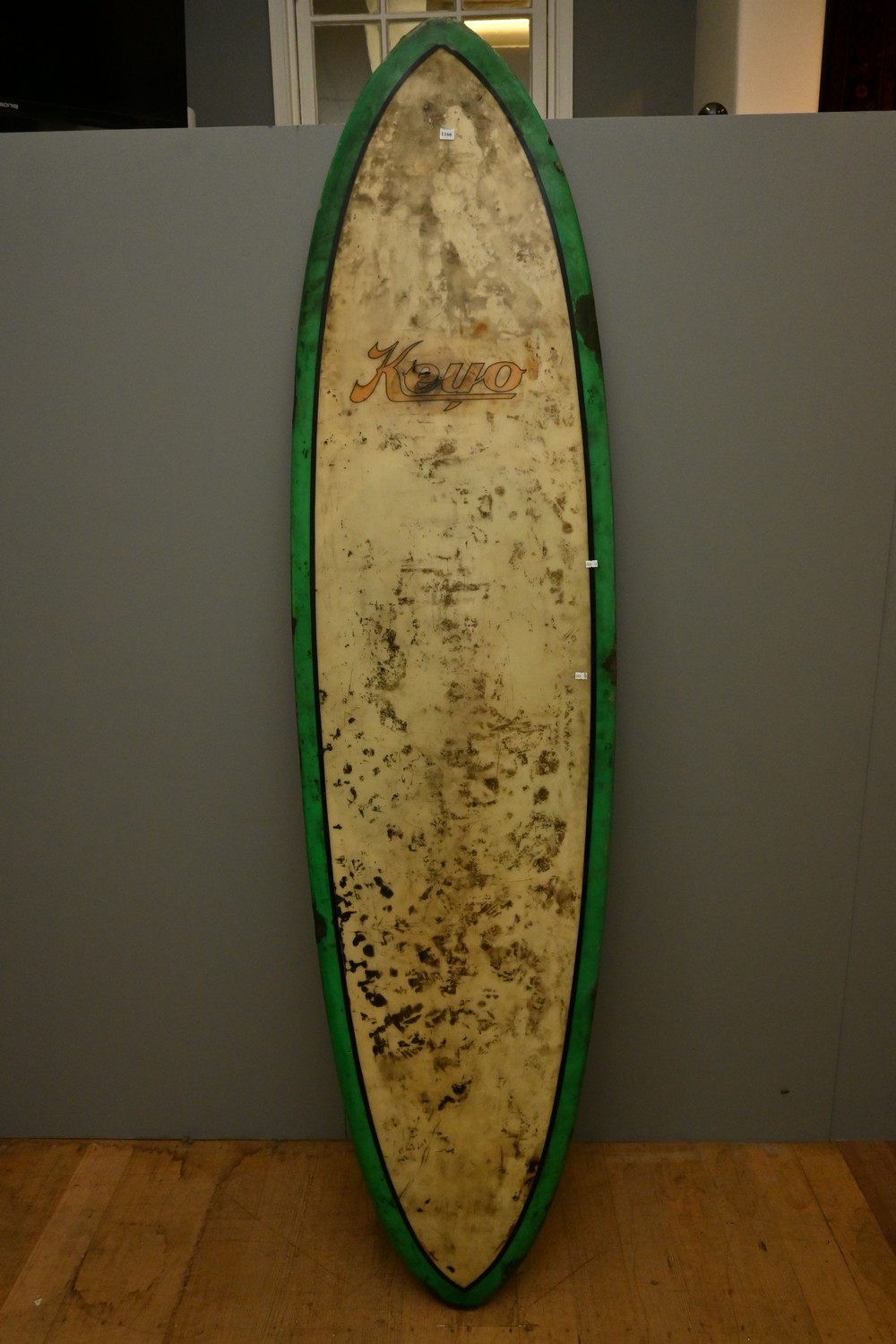 A VINTAGE SINGLE FIN KEYO SURFBOARD (A/F) (225H X 60W CM) (LEONARD JOEL DELIVERY SIZE: X-LARGE)