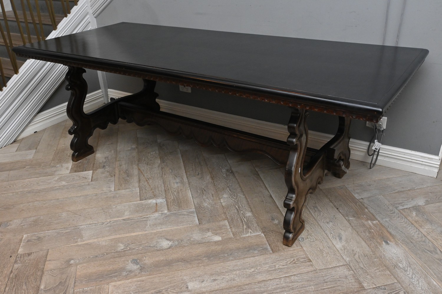 A STAINED HARDWOOD DINING TABLE IN ITALIAN BAROQUE STYLE (A/F) (80H X 230W X 97D CM) (PLEASE NOTE THIS HEAVY ITEM MUST BE REMOVED BY CARRIERS AT THE CUSTOMER'S EXPENSE. LEONARD JOEL STAFF CANNOT ASSIST CARRYING THIS ITEM) (X-LARGE ITEM)