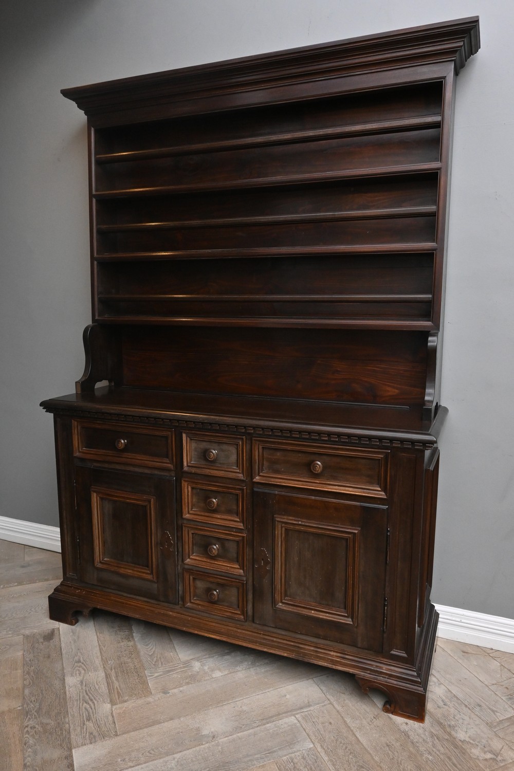 A STAINED HARDWOOD HIGH DRESSER IN 18TH CENTURY STYLE (A/F) (240H X 165W X 54D CM) (PLEASE NOTE THIS HEAVY ITEM MUST BE REMOVED BY CARRIERS AT THE CUSTOMER'S EXPENSE. LEONARD JOEL STAFF CANNOT ASSIST CARRYING THIS ITEM) (X-LARGE ITEM)
