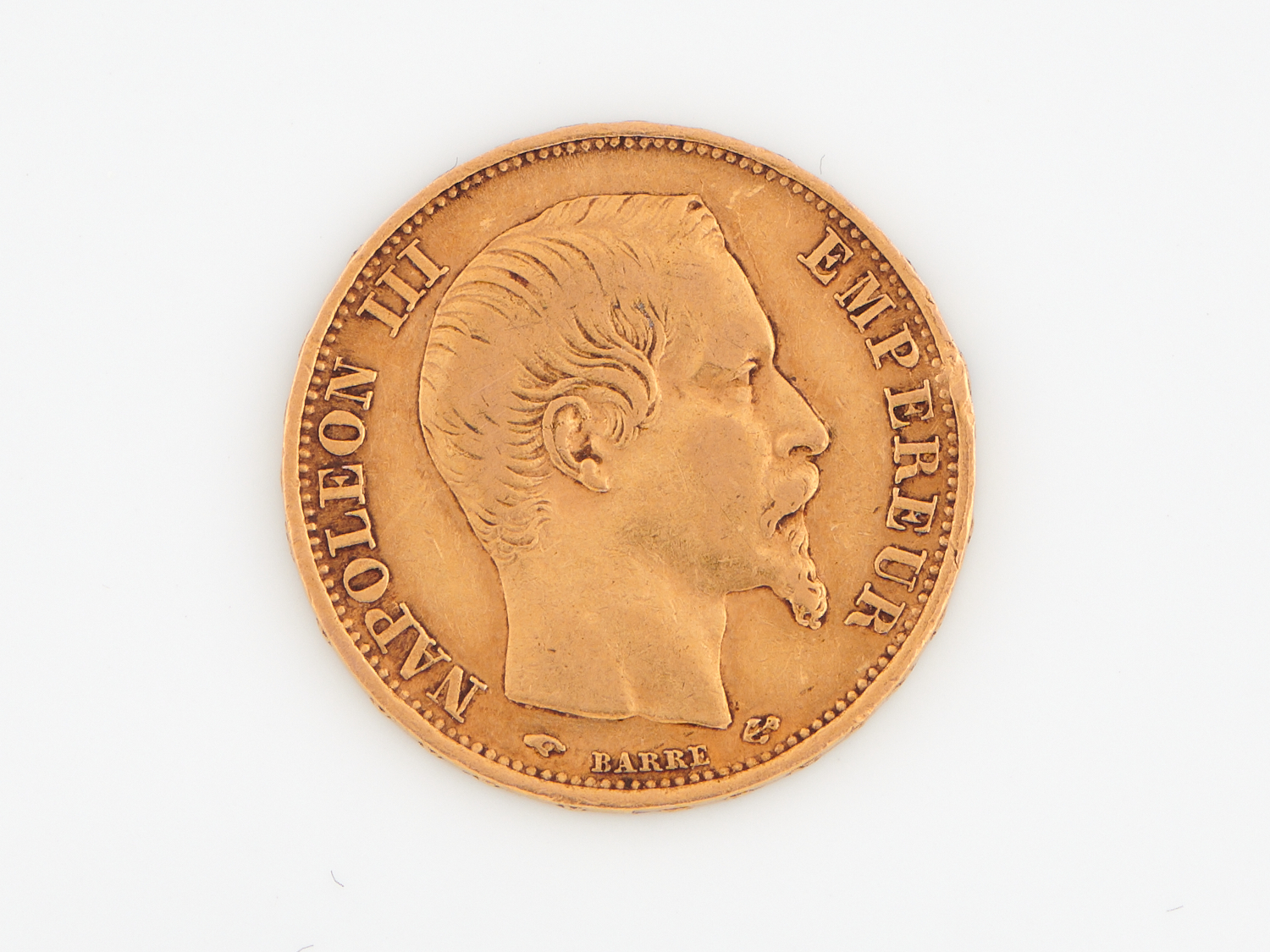 A FRENCH 20 FRANCS 1859 COIN IN HIGH CARAT GOLD, 6.4GMS