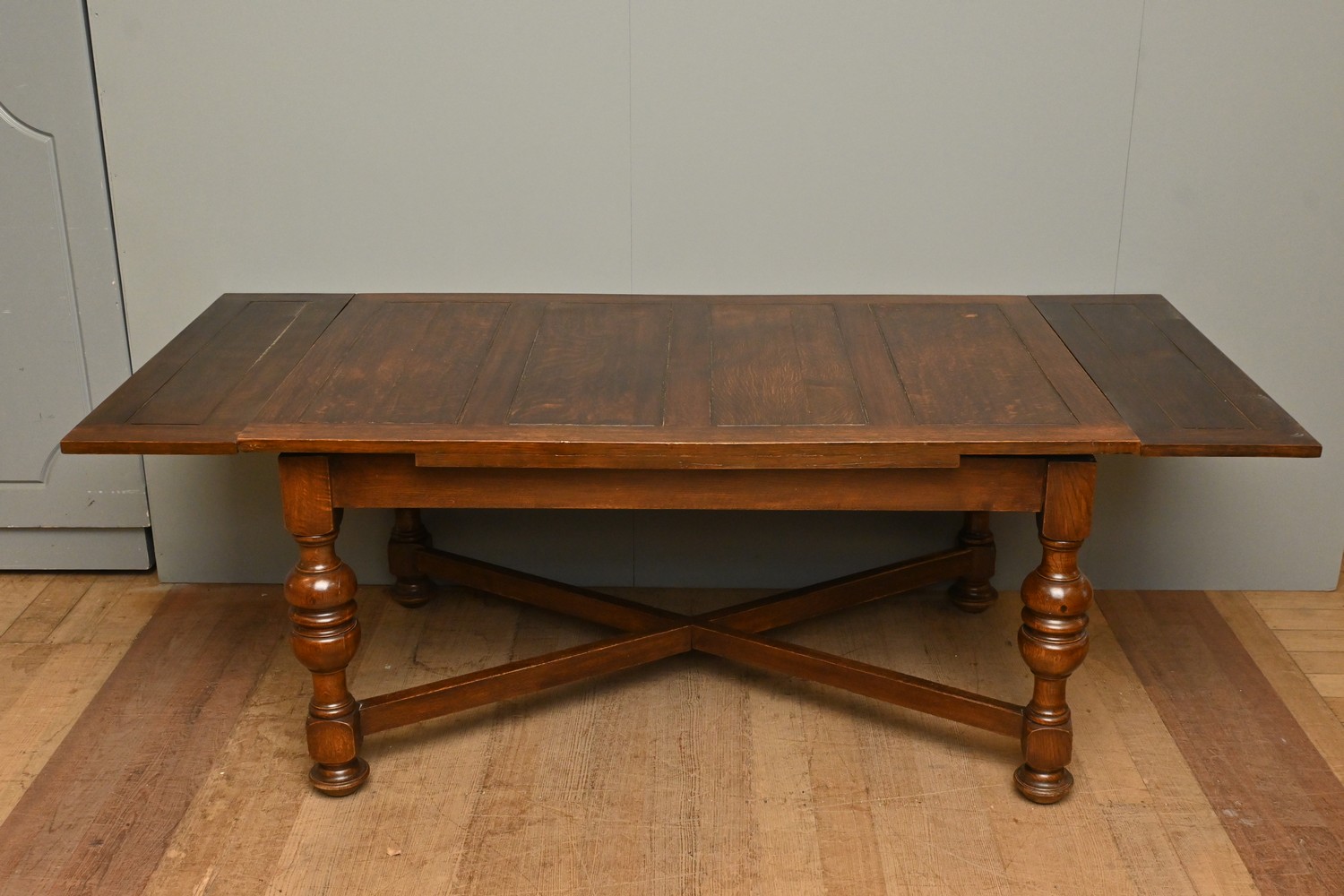 A FLEMISH STYLE OAK DRAW-LEAF DINING TABLE (A/F) (74H X 240W X 98D CM) (PLEASE NOTE THIS HEAVY ITEM MUST BE REMOVED BY CARRIERS AT THE CUSTOMER'S EXPENSE. LEONARD JOEL STAFF CANNOT ASSIST CARRYING THIS ITEM) (X-LARGE ITEM)