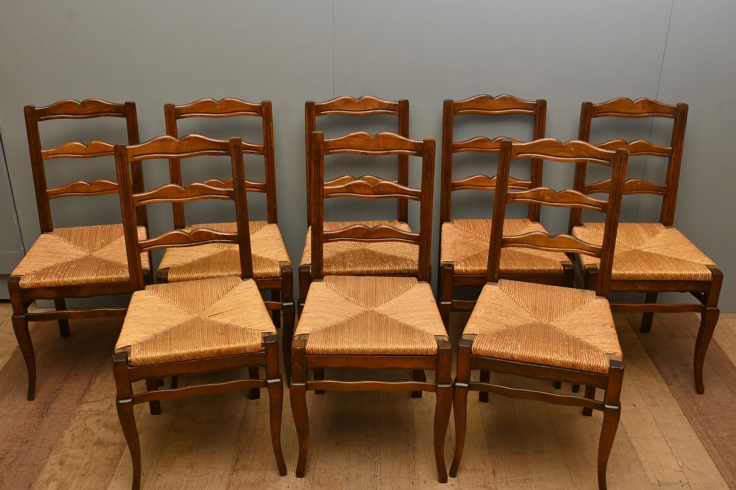 A SET OF EIGHT FRENCH STYLE LADDER BACK CHAIRS (A/F) (88H X 41W X 42D CM) (LEONARD JOEL DELIVERY SIZE: X-LARGE)