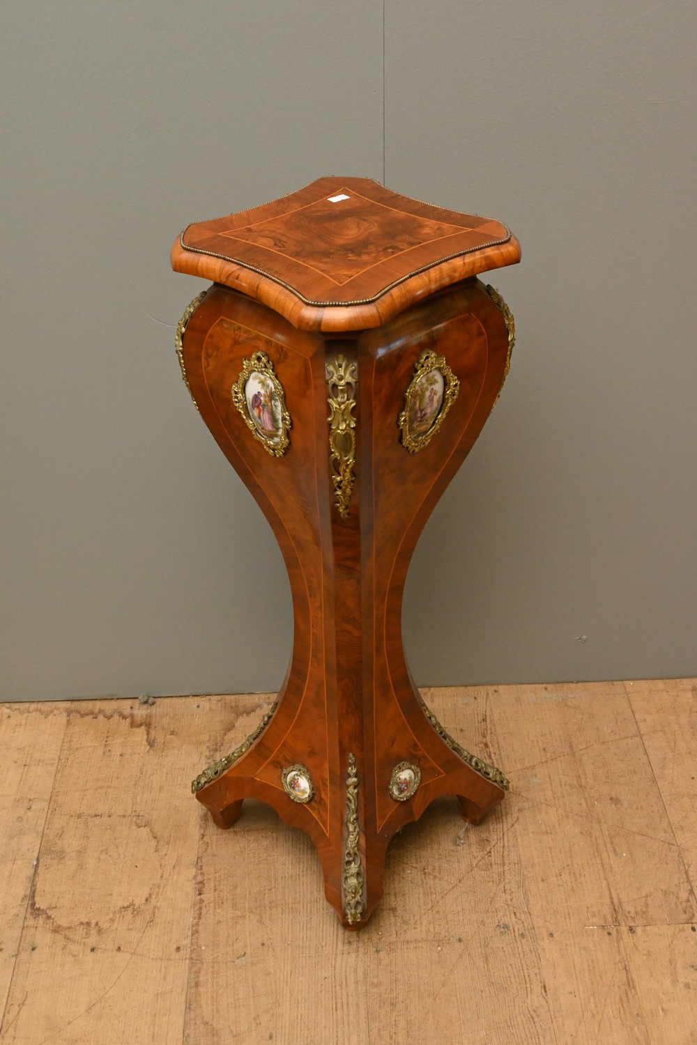 A LATE 19th CENTURY FRENCH FIGURED WALNUT PEDESTAL, WITH PAINTED PORCELAIN AND GILT METAL MOUNTS (85H X 29W X 29D CM) (LEONARD JOEL DELIVERY SIZE: LARGE)