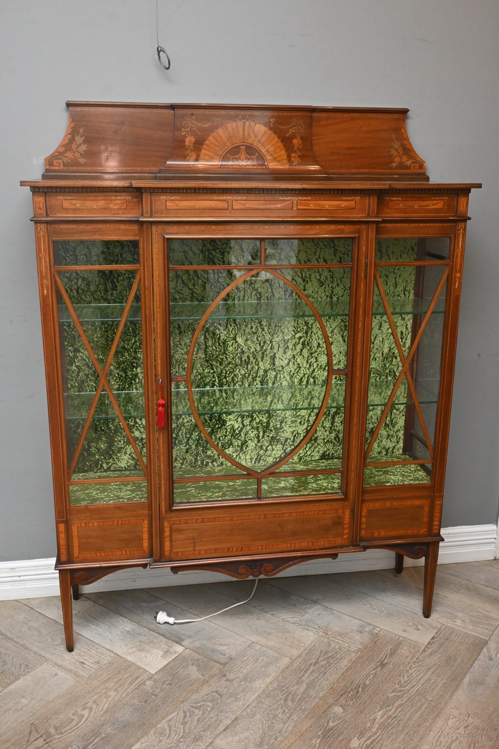 A LATE 19th / EARLY 20th CENTURY ENGLISH MAHOGANY AND GLAZED DISPLAY CABINET, FINELY INLAID THROUGHOUT - UNTESTED (163H X 125W X 35D CM) (PLEASE NOTE THIS HEAVY ITEM MUST BE REMOVED BY CARRIERS AT THE CUSTOMER'S EXPENSE. LEONARD JOEL STAFF CANNOT ASSIST CARRYING THIS ITEM) (X-LARGE ITEM)