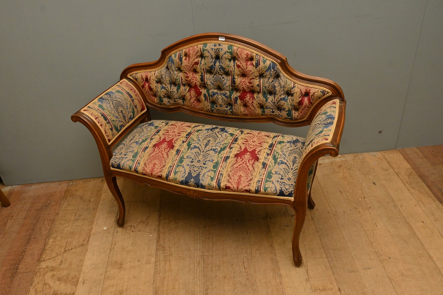 A SMALL VICTORIAN-STYLE BEECH AND UPHOLSTERED SOFA (A/F) (86H X 110W X 45D CM) (LEONARD JOEL DELIVERY SIZE: LARGE)