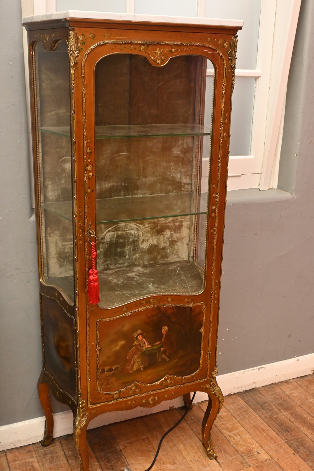 A MARBLE-TOPPED DISPLAY CABINET IN TRANSITIONAL LOUIS XV / LOUIS XVI MANNER, WITH PAINTED DECORATION AND GILT METAL MOUNTS (A/F UNTESTED) (164H X 69W X 35D CM) (LEONARD JOEL DELIVERY SIZE: X-LARGE)