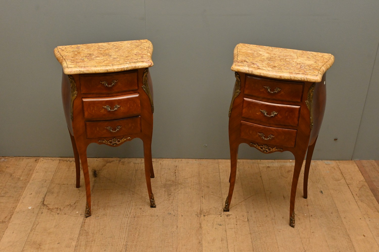 A PAIR OF MARBLE-TOPPED MARQUETRY SIDE TABLES IN TRANSITIONAL LOUIS XV / LOUIS XVI MANNER (73H X 42W X 28D CM) (LEONARD JOEL DELIVERY SIZE: LARGE)