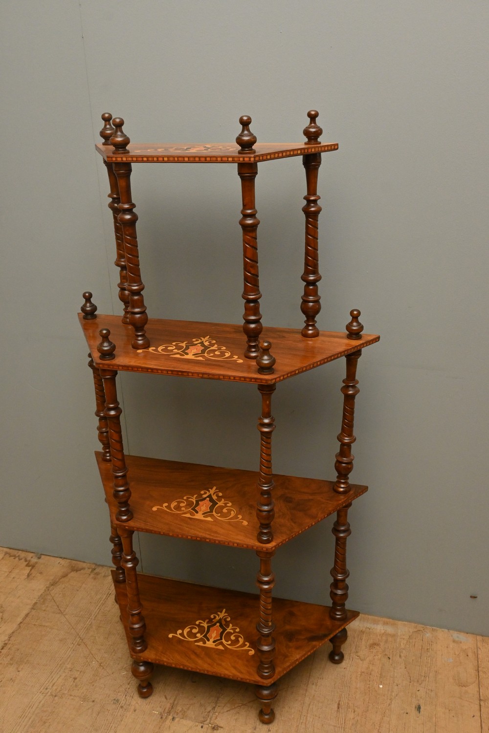 A LATE VICTORIAN FIGURED WALNUT AND INLAID WHATNOT (135H X 74W X 27D CM) (LEONARD JOEL DELIVERY SIZE: LARGE)