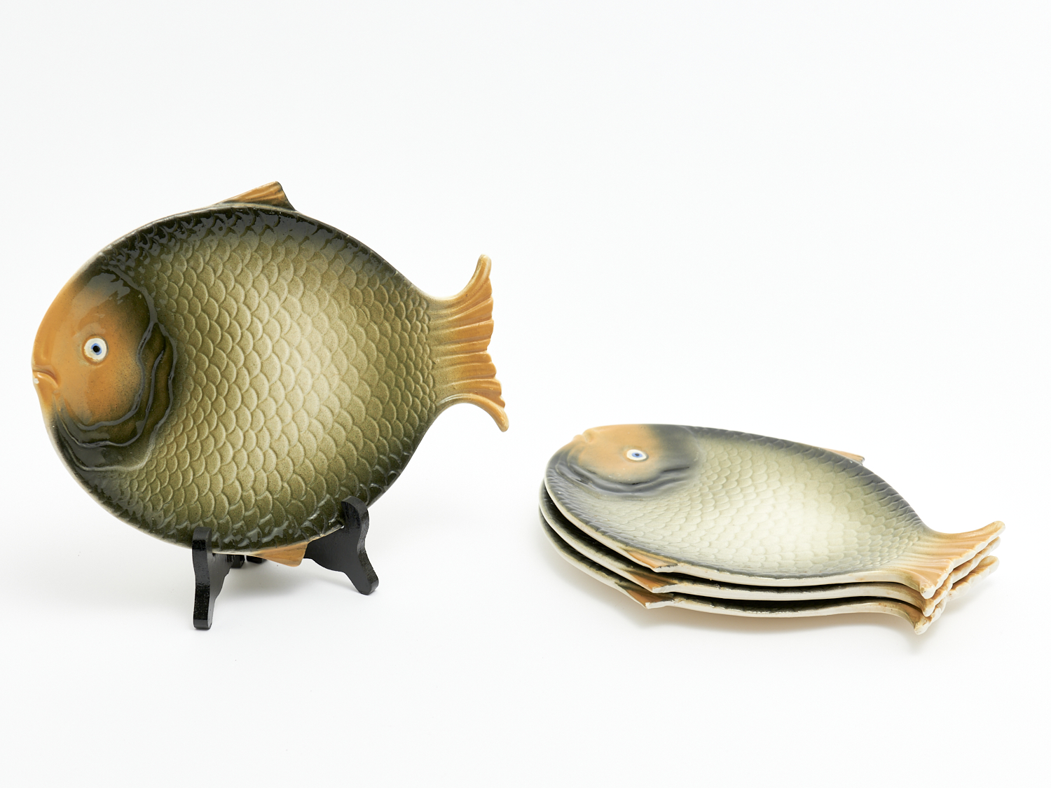 A SET OF FOUR ANTIQUE FISH-FORM SERVING PLATES (A/F) W.25.5CM, LEONARD JOEL LOCAL DELIVERY: SMALL