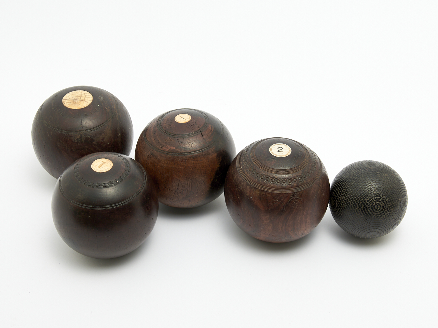 AN ASSEMBLED SET OF FOUR 19TH-CENTURY LIGNUM VITAE LAWN BOWLS TOGETHER WITH A JACK, BOWL DIA.13.5CM, LEONARD JOEL LOCAL DELIVERY: MEDIUM